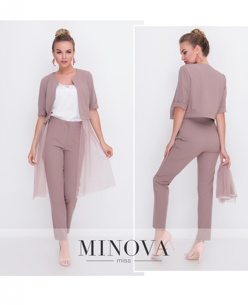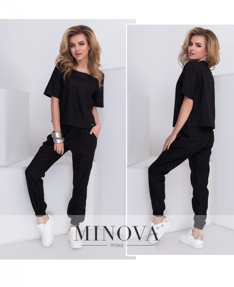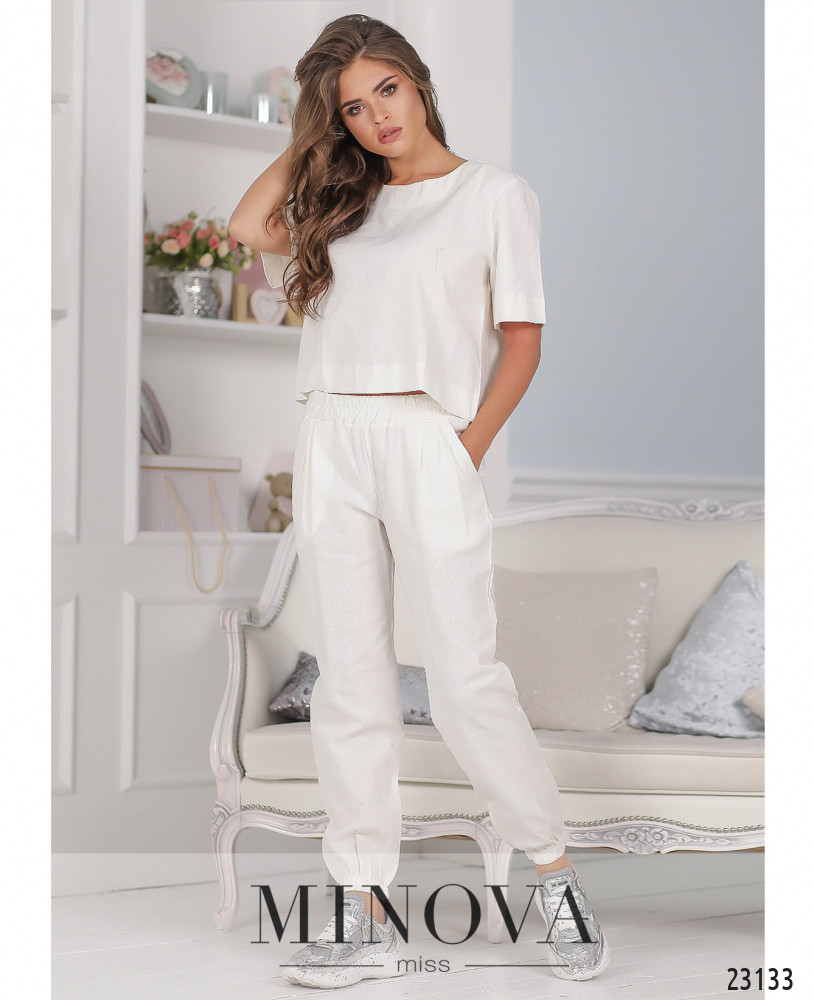 Зручний повсякденний мінімалістичний костюм-двійка з футболкою та брюками. Брюки з високою посадкою, до поясу вшито резинку, в манжети також вшиті резинки, з боків - кишені в шві. Футболка без кишень та застібок.