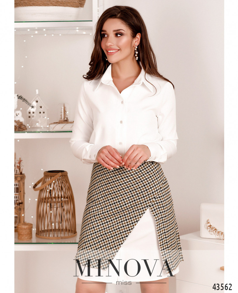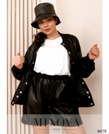 Елегантний костюм-двійка, піджак двобортний, застібається на лівий гудзик. Є кишені в швах. Права полочка з фігурним краєм. Лацкани різьблені. Піджак з підкладкою. На полочках довгий повздовжній шов. Брюки з високою посадкою, застібаються на блискавку під ширинкою та гудзик, з боків - кишені в шві, внизу невеликі розрізи з боків.