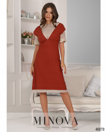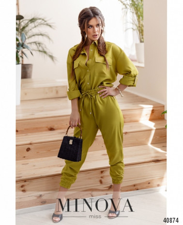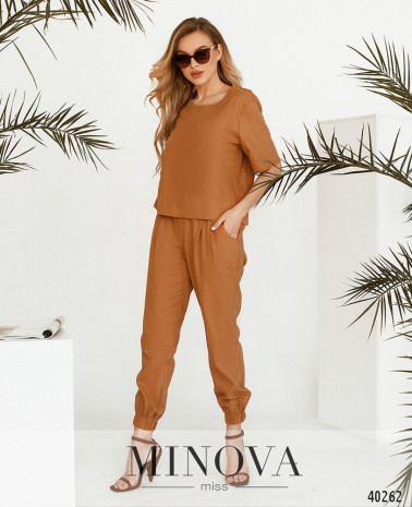 Оригинальный костюм с сарафаном и лёгкой кофточкой. Сарафан без карманов, застёгивается на молнию, вшитую по спинке. Снизу на подоле подшита лёгкая ткань, как на блузе. Вырез украшен спереди и по спинке декоративной строчкой-швом. Блуза без застёжек и карманов, с небольшими отворотами на рукавах, вырез горловины "лодочка".