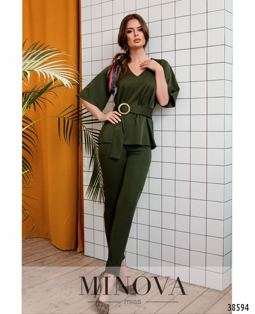 Строгий легкий костюм з брюками та блузою. Блуза з вирізом горловини V-форми, рукава дещо розкльошені, без манжетів, застібок та кишень немає. Брюки з високою талією, з напрасованими «стрілками», застібаються на гудзик та блискавку під ширинкою, до поясу ззаду вшито резинку, з боків - кишені. В комплекті – пояс у колір з круглою пряжкою.
