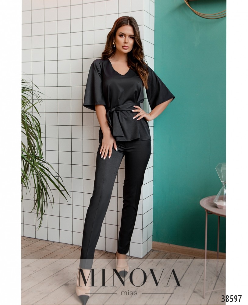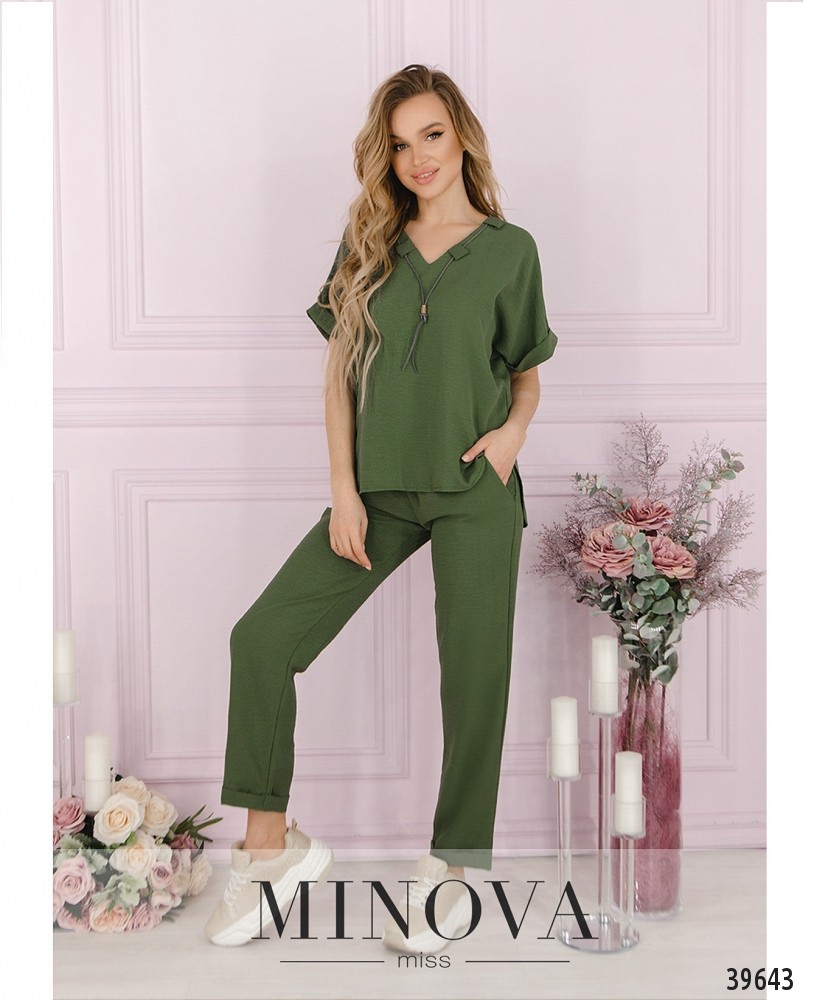 Привабливий костюм-двійка з легкою блузою та брюками. Блуза з вирізом горловини V-форми, без кишень та застібок, декорована шнурком, пропущеним через петельки, рукава з невеликими відворотами. Поділ по спинці довше. Брюки з високою талією, з боків кишені в швах, до поясу вшито резинку, внизу підвороти.