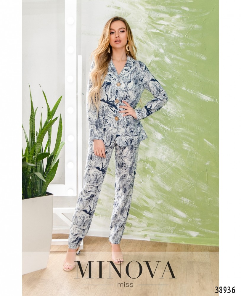 Чарівний костюм-двійка з жакетом та брюками. Брюки з високою талією, до поясу вшито резинку та пропущено шнурок, з боків - кишені в шві. Жакет однобортний, з трьома гудзиками, без підкладки. Рукава без манжетів. З боків - накладні кишені.