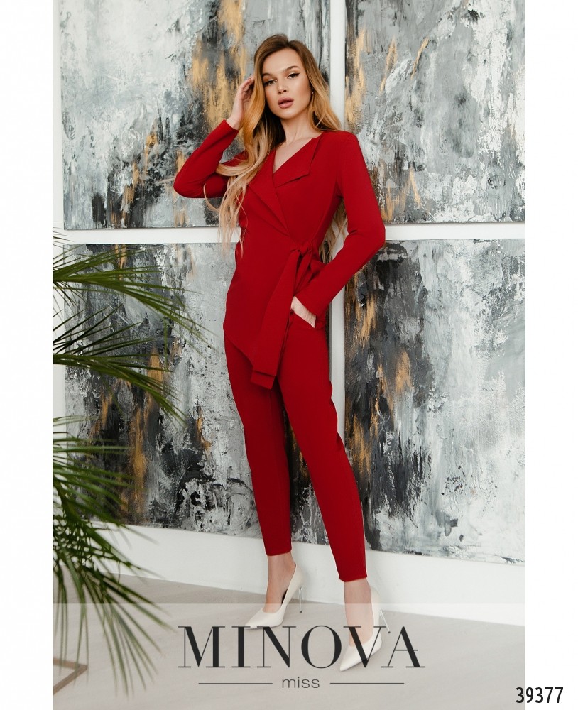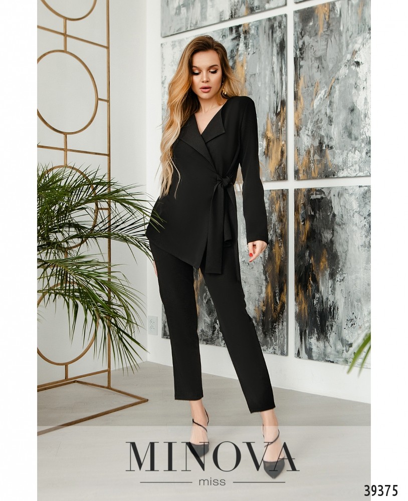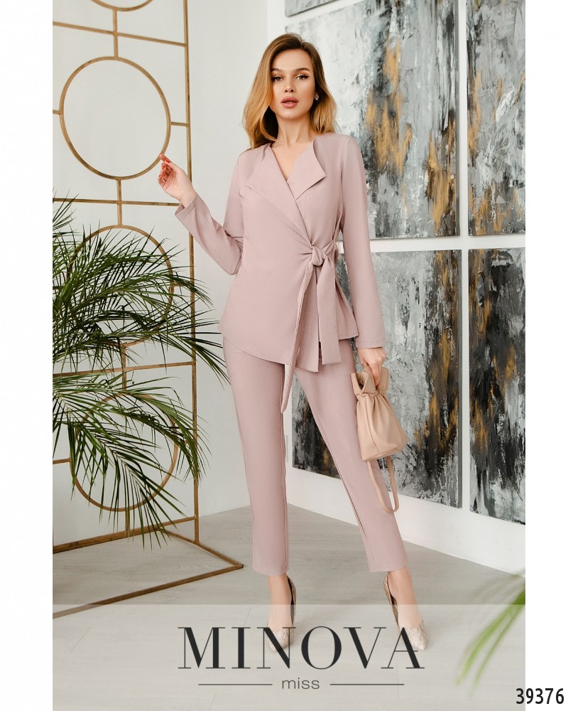 Мінімалістичний привабливий костюм з жакетом та брюками. Жакет з підплічниками, без кишень, без застібок, зав\'язується на підшитий збоку поясок. Рукава без манжетів. Підкладки немає. На грудях виточки. Брюки із середньою посадкою, застібаються на змійку під ширинкою та на гудзик, з боків - кишені в шві, без манжетів. На поясі - шлівки для ремня.