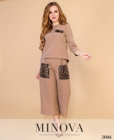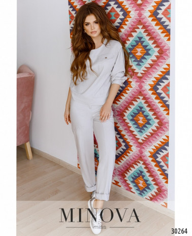 зсередини – м\'яка підкладка з перфорацією. Ззаду внизу на спинці невеликий виріз. Брюки з підшитою до поясу резинкою, в наявності кишені.
