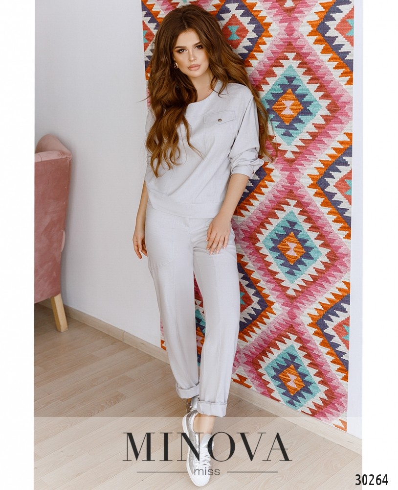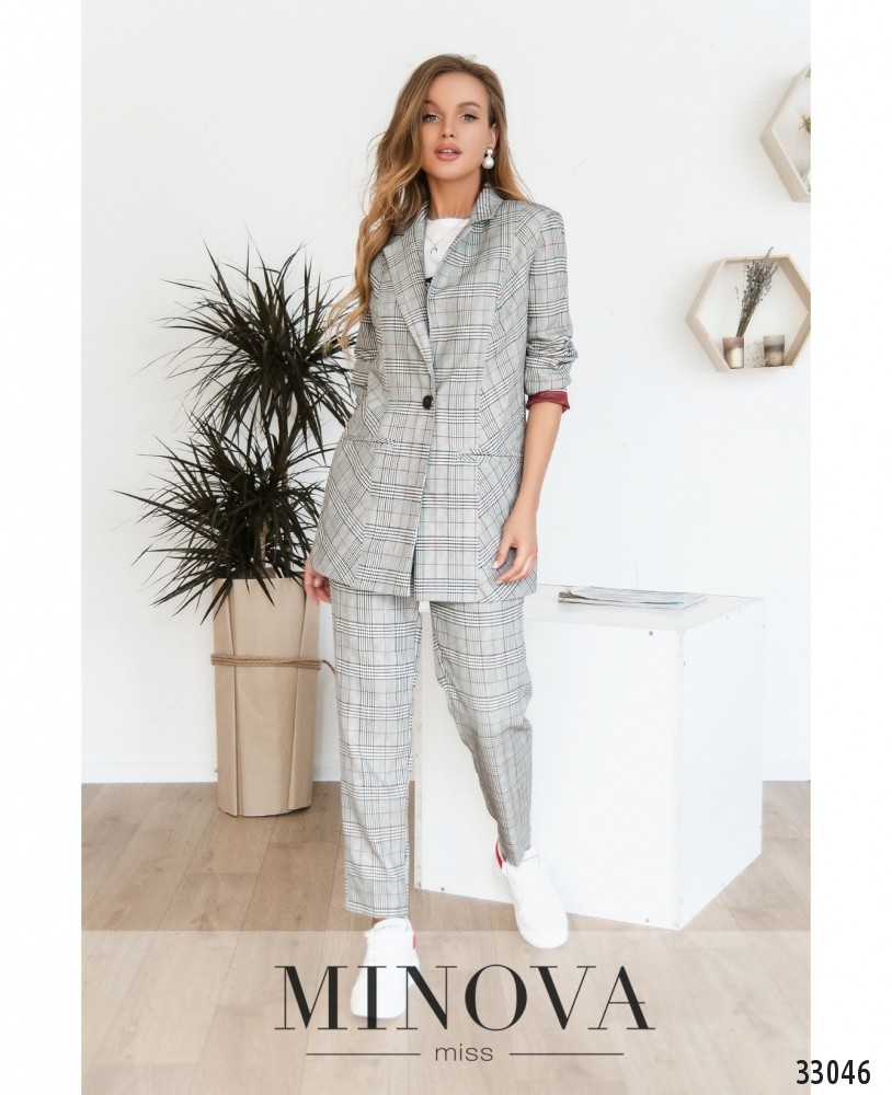 Стильний костюм-двійка. Піджак з одним гудзиком та декоративними клапанами повної довжини. Матеріал костюма щільний,