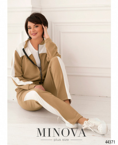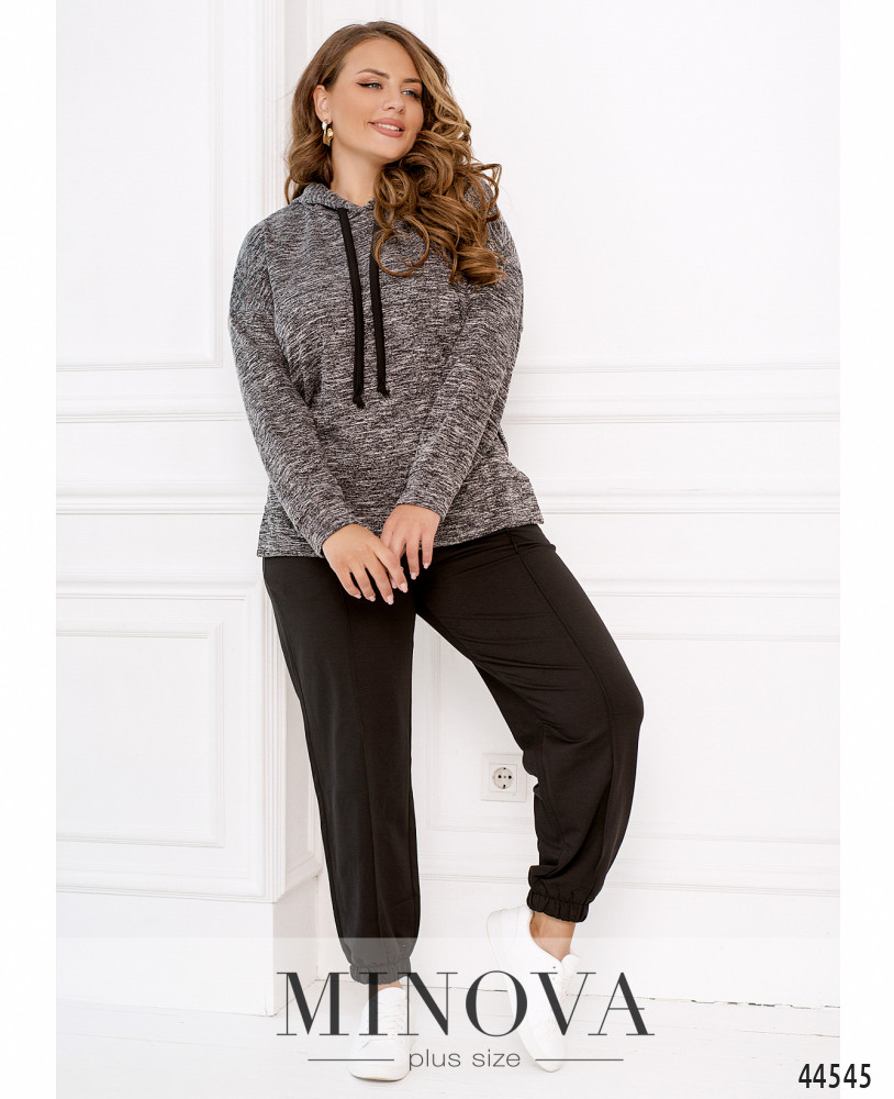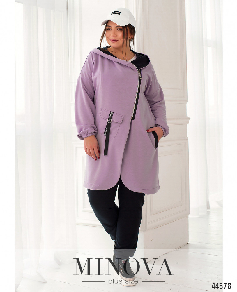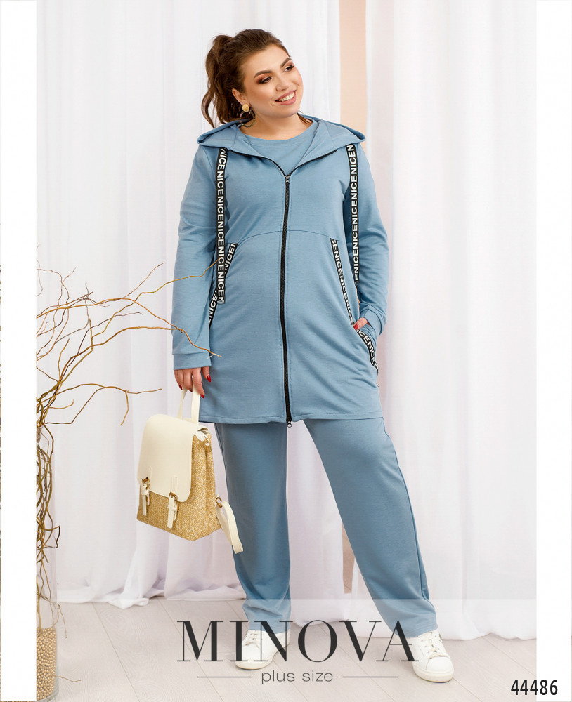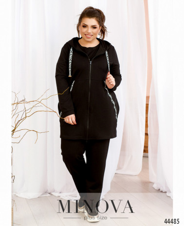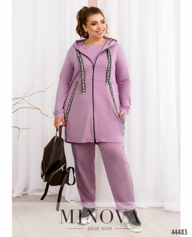 Оригінальний костюм-трійка плюс сайз. Толстовка довга, прикрашена яскравими стрічками, такі ж стрічки, але з металевими накінечниками, пропущено через капюшон. Підкладки немає, з боків - кишені в шві. Рукава з невеликими м'якими манжетами. Футболка з коротким рукавом з м'яким манжетом, виріз горловини півкруглий, застібок та кишень немає. Брюки з високою талією, до поясу вшито резинку, застібок немає, з боків кишені в шві.