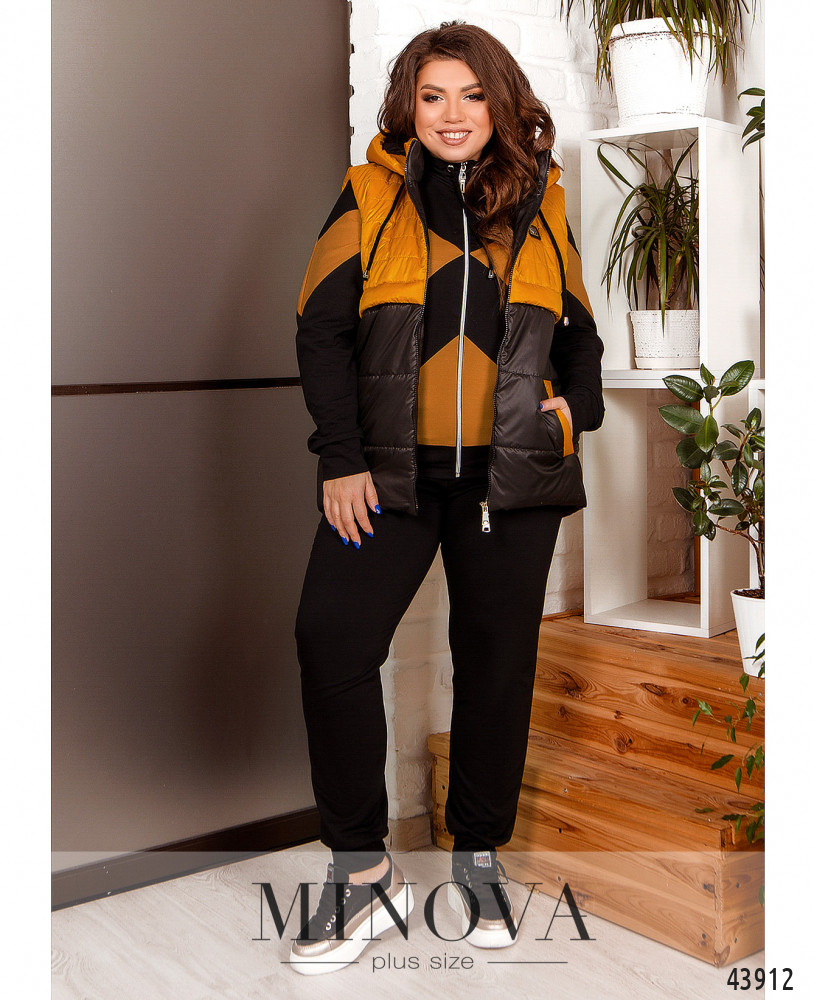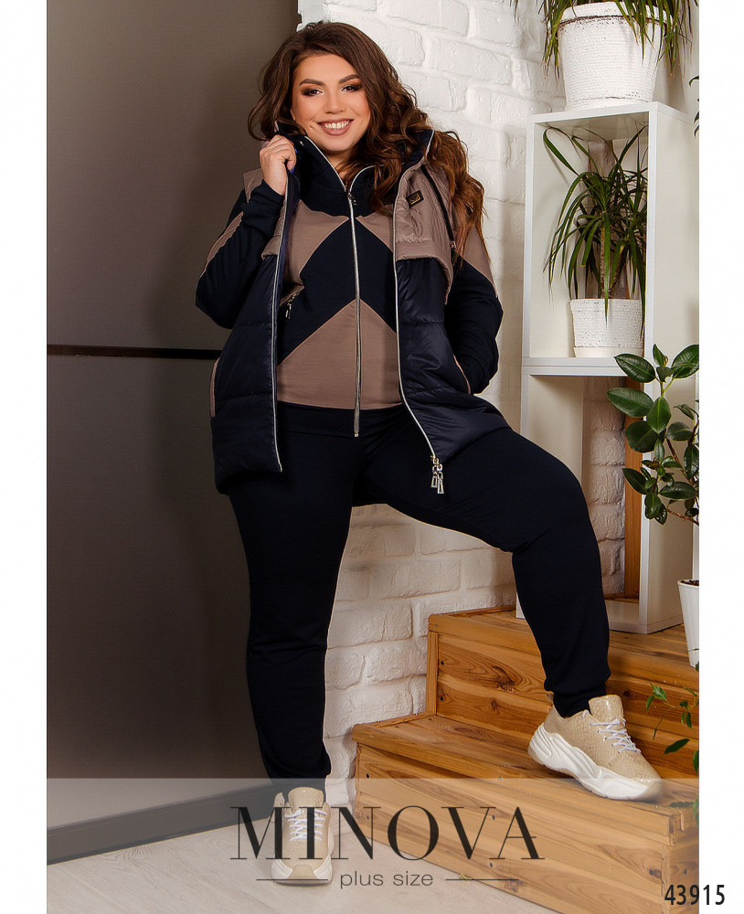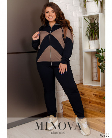 Комфортный и элегантный спортивный костюм большого размера из модной и практичной натуральной ткани. Толстовка с капюшоном, через него пропущен шнурок; карманов и застёжек нет, рукава и подол с мягкими манжетами. По бокам подола небольшие разрезы, спинка немного длиннее. Брюки со вшитой в пояс и в манжеты резинкой, посадка высокая, по бокам - карманы.