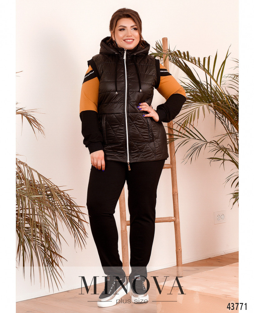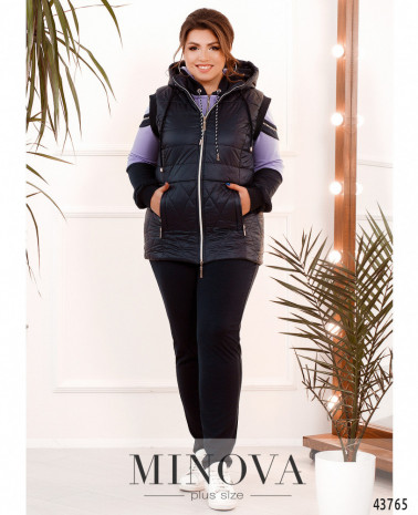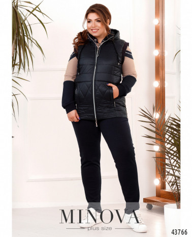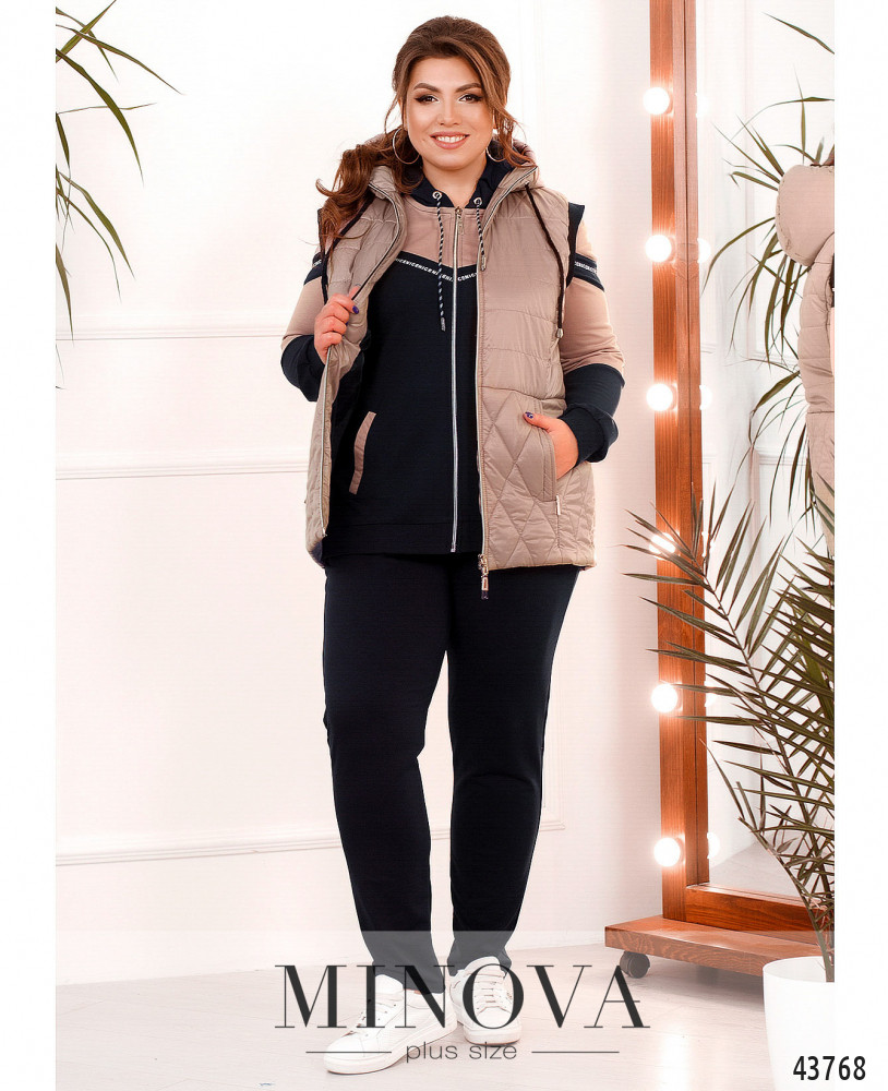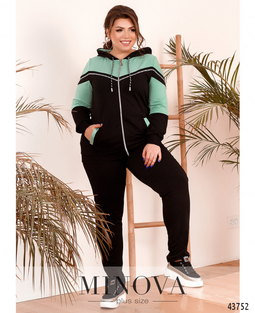 Комфортний та елегантний спортивний костюм великого розміру з модної та практичної натуральної тканини. Толстовка з капюшоном, через нього пропущено шнурок; кишень і застібок немає. Рукава і поділ із м'якими манжетами. По сторонам подолу невеликі розрізи, спинка трохи довша. Брюки із ушитою до поясу та манжетів резинкою, посадка висока, по сторонам - кишені у швах.