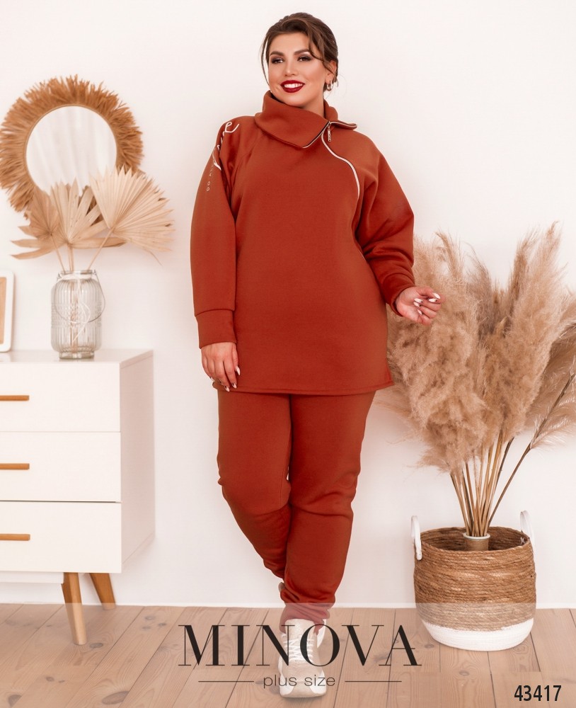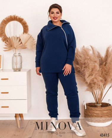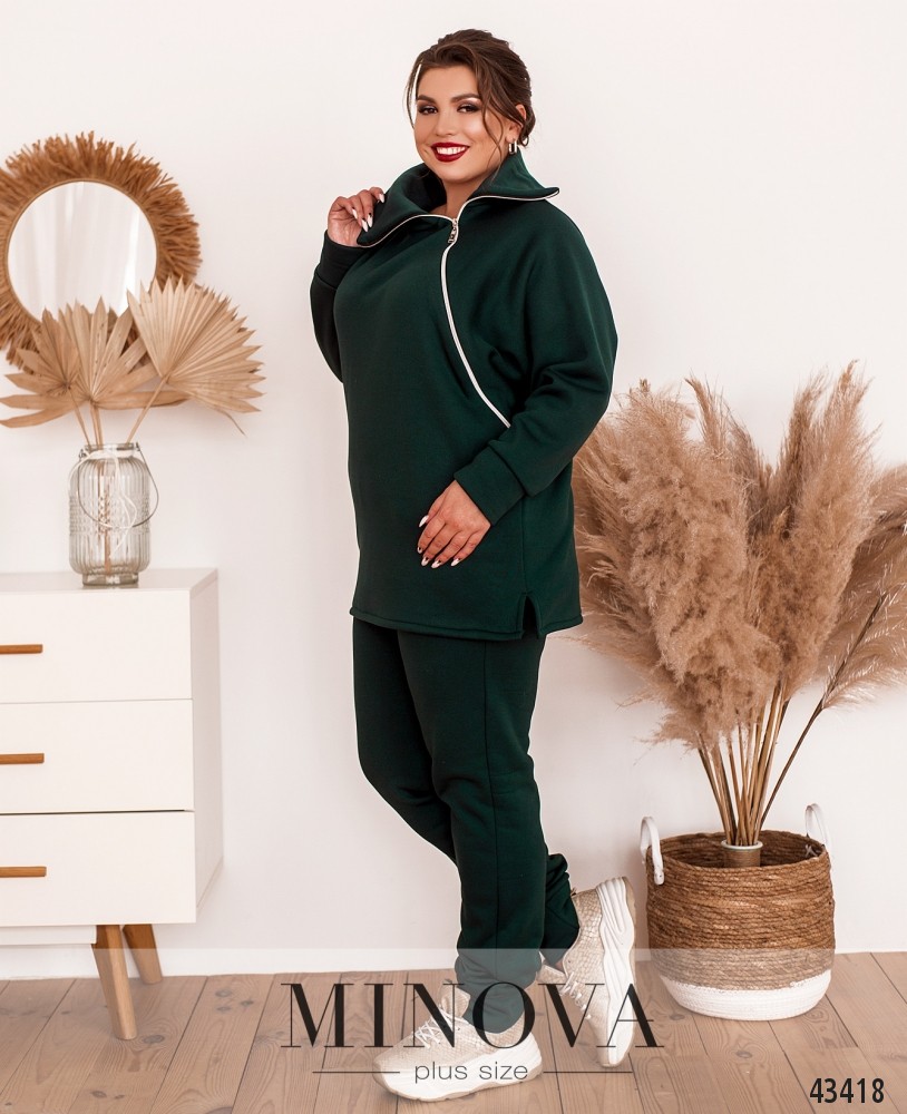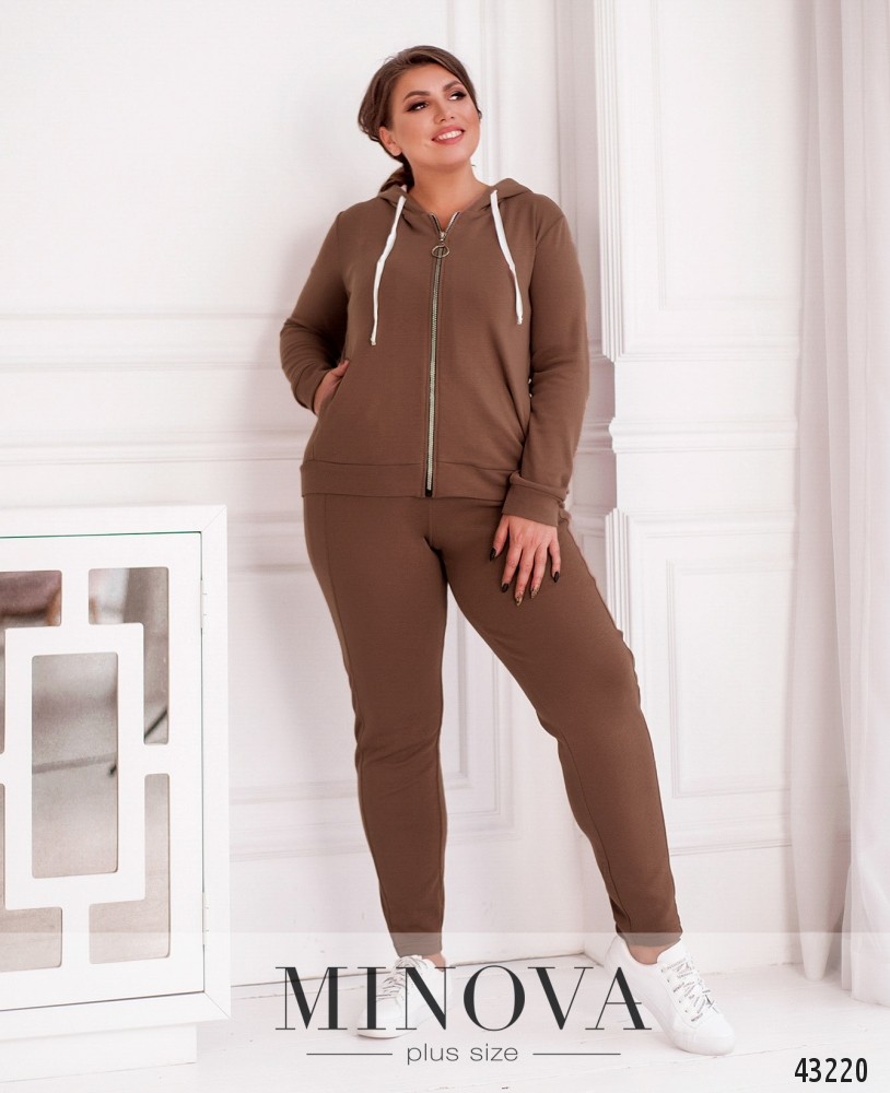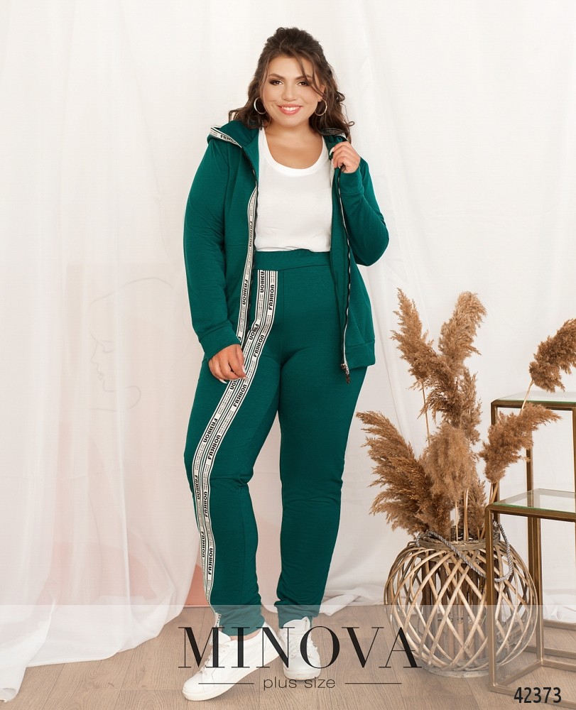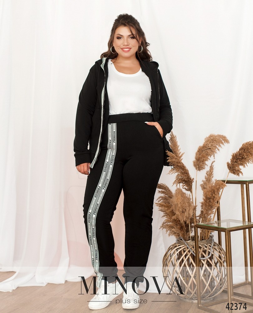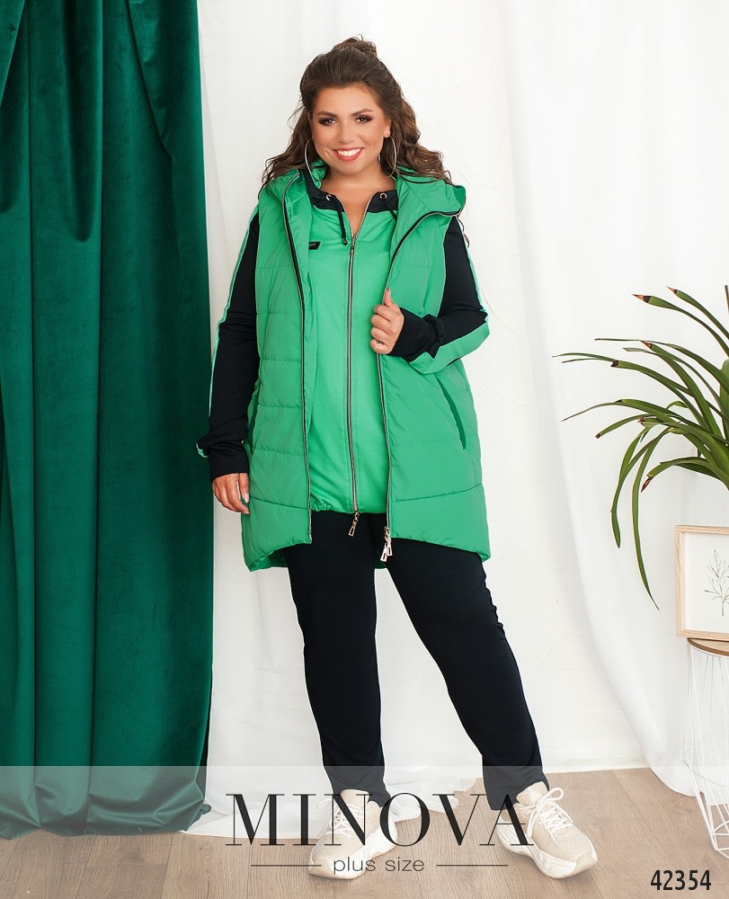 Костюм-трійка великого розміру. Жилетка прошита, з боків - кишені в шві під блискавкою, застібається на блискавку, блискавка з двома бігунками, зсередини підкладка. Світшот з капюшоном та кишенями, на грудях декоративна нашивка, на рукавах лампаси. Застібається на блискавку з двома бігунками. Брюки однотонні,