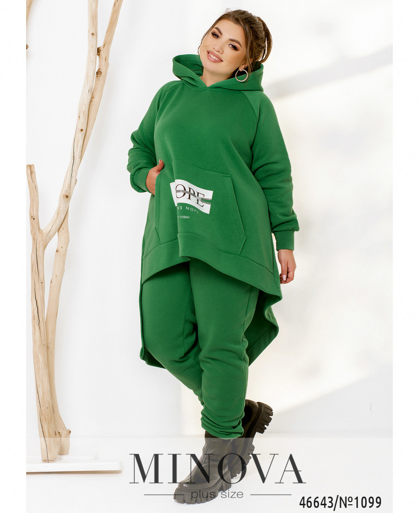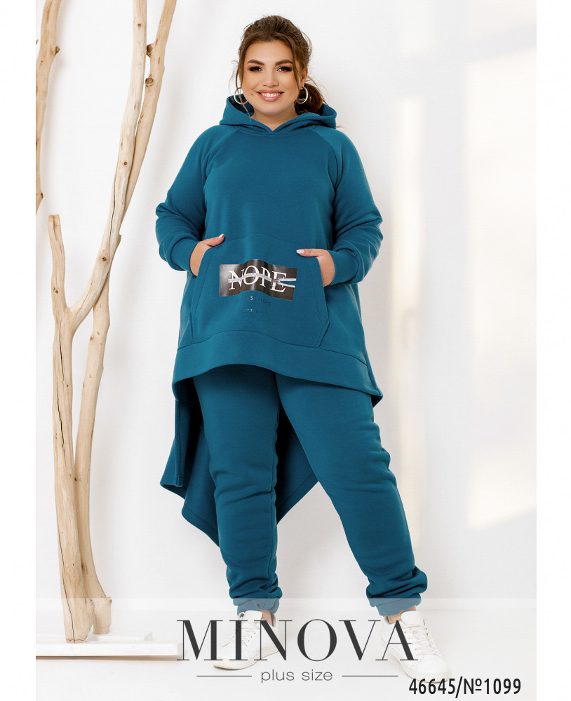 Оригінальний яскравий костюм батал подарує тепло і комфорт в прохолодні дні. Кофта з кишенями і капюшоном, що декорована яскравою стрічкою з принтом спереду і на рукавах з манжетами, застібається на змійку спереду по центру. Штани з високою талією на резинці доповнені кишенями в бічних швах і манжетами.