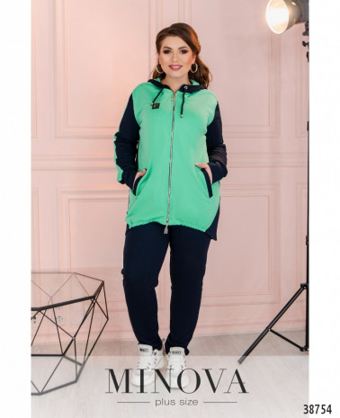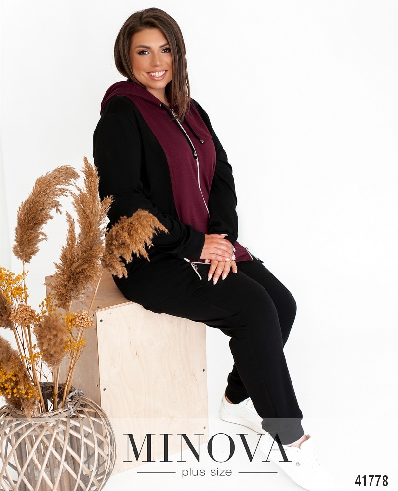 Стильний спортивний костюм великого розміру з актуальним принтом на футболці та на брюках в вигляді лампасів. Футболка без кишень та застібок, брюки зі вшитою до поясу резинкою, з боків кишені в швах, посадка висока.