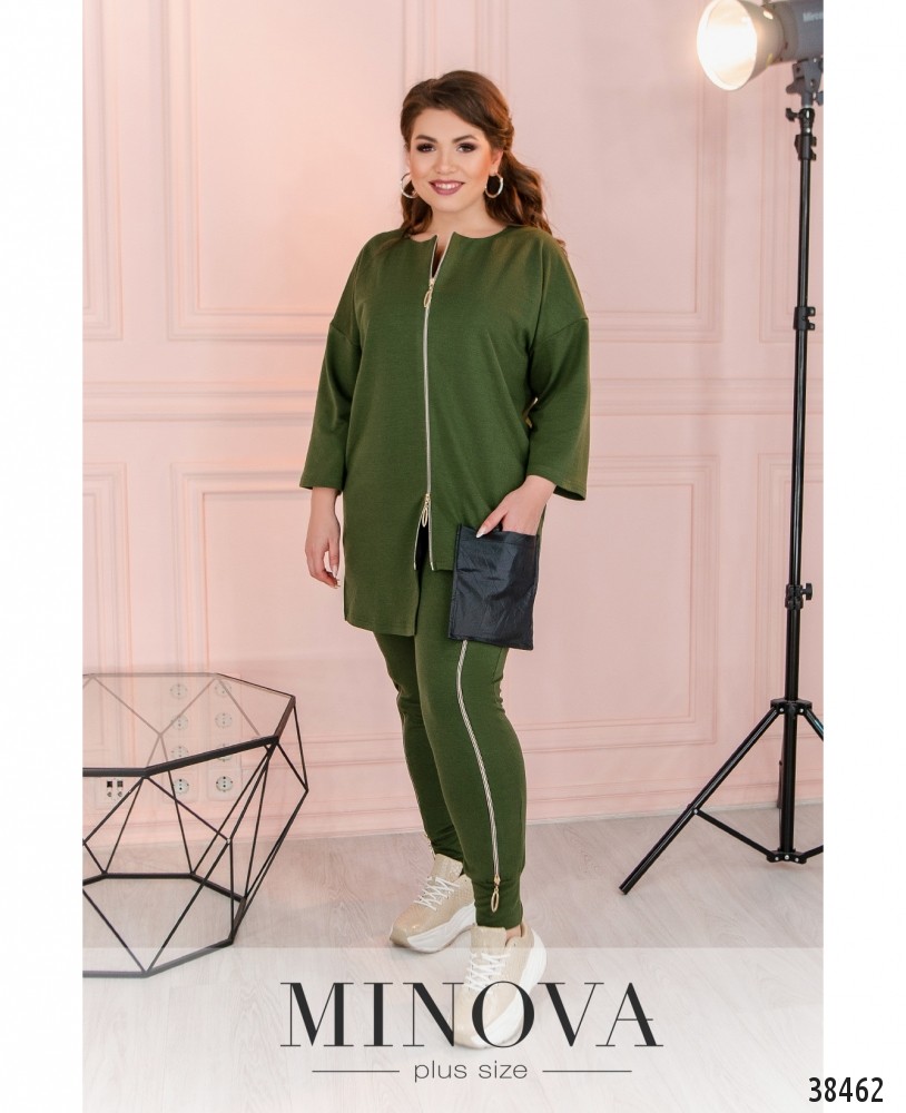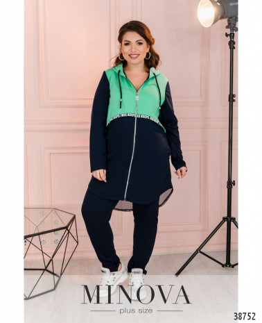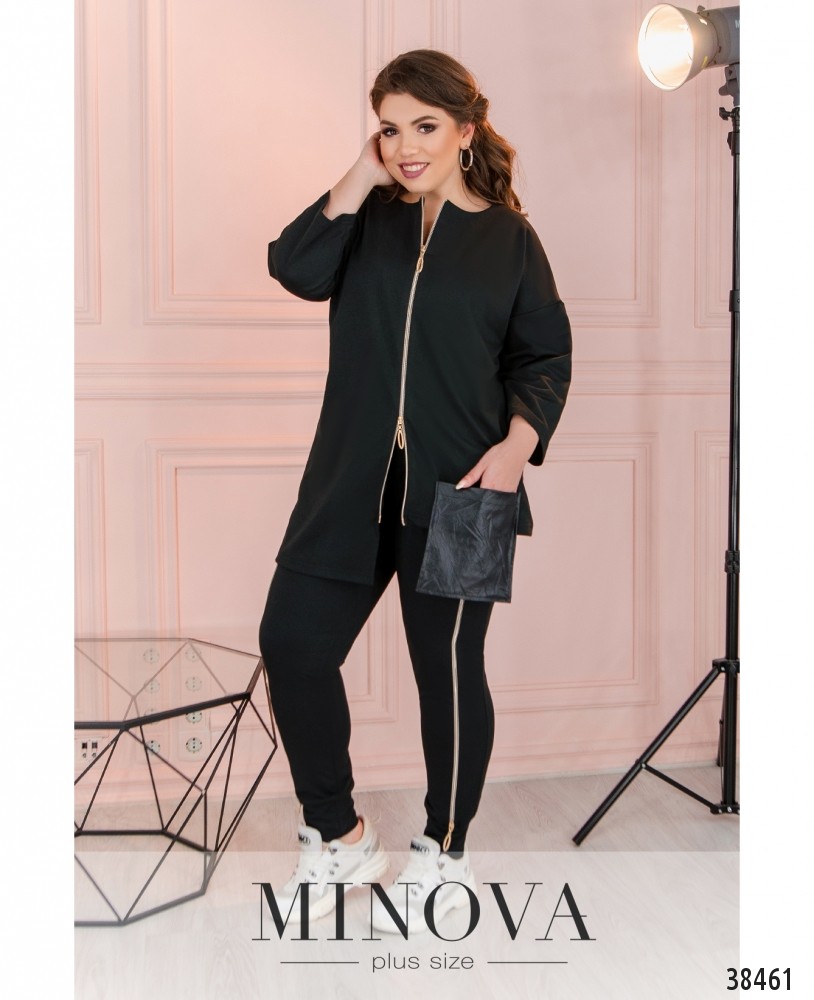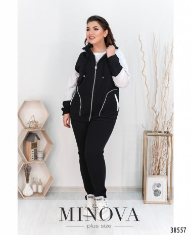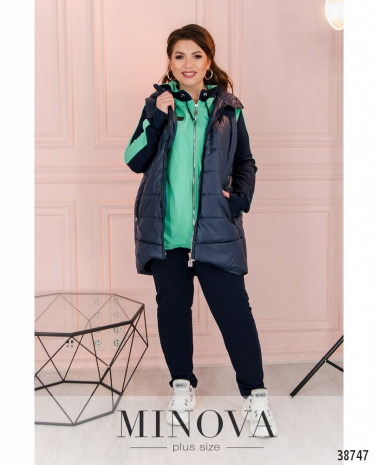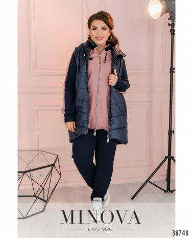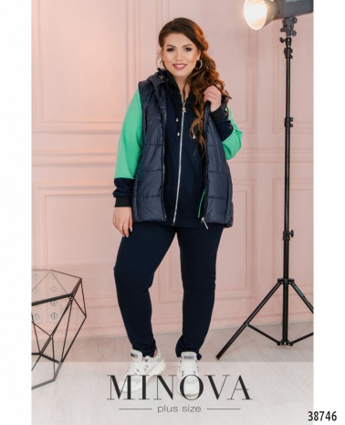 Стильный и удобный костюм-тройка плюс сайз с жилеткой, кофтой и брюками. Жилетка простёганная, с врезными карманами под молнией, с капюшоном, застёгивается на молнию по центру. Кофта также с капюшоном, через него пропущен шнурок, на правой стороне груди - декоративная нашивка, молния по центру - с двумя бегунками, по бокам - врезные карманы. Брюки с высокой посадкой, вшитой в пояс резинкой, по бокам карманы, без манжет.