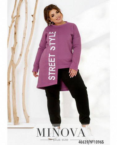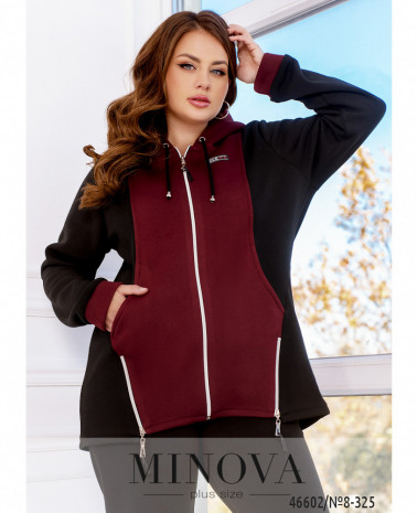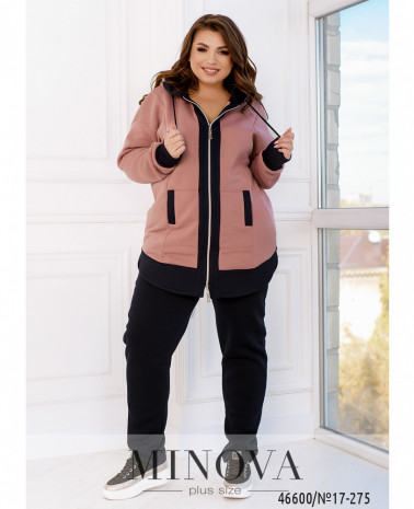 Яскравий спортивний костюм, доповнений контрастними однотонними вставками, не тільки дуже теплий, але і комфортний. У комплект входять однотонні мінімалістичні штани на резинці з кишенями, а також виразна кофта з капюшоном, доповнена довгими рукавами з манжетами і двома невеликими робочими змійками, що виконують декоративну функцію.