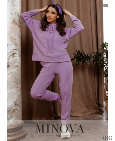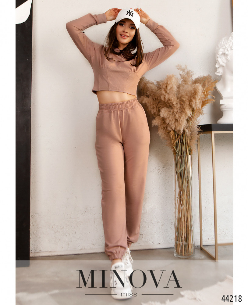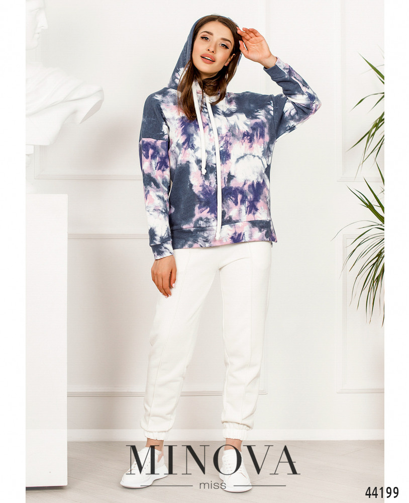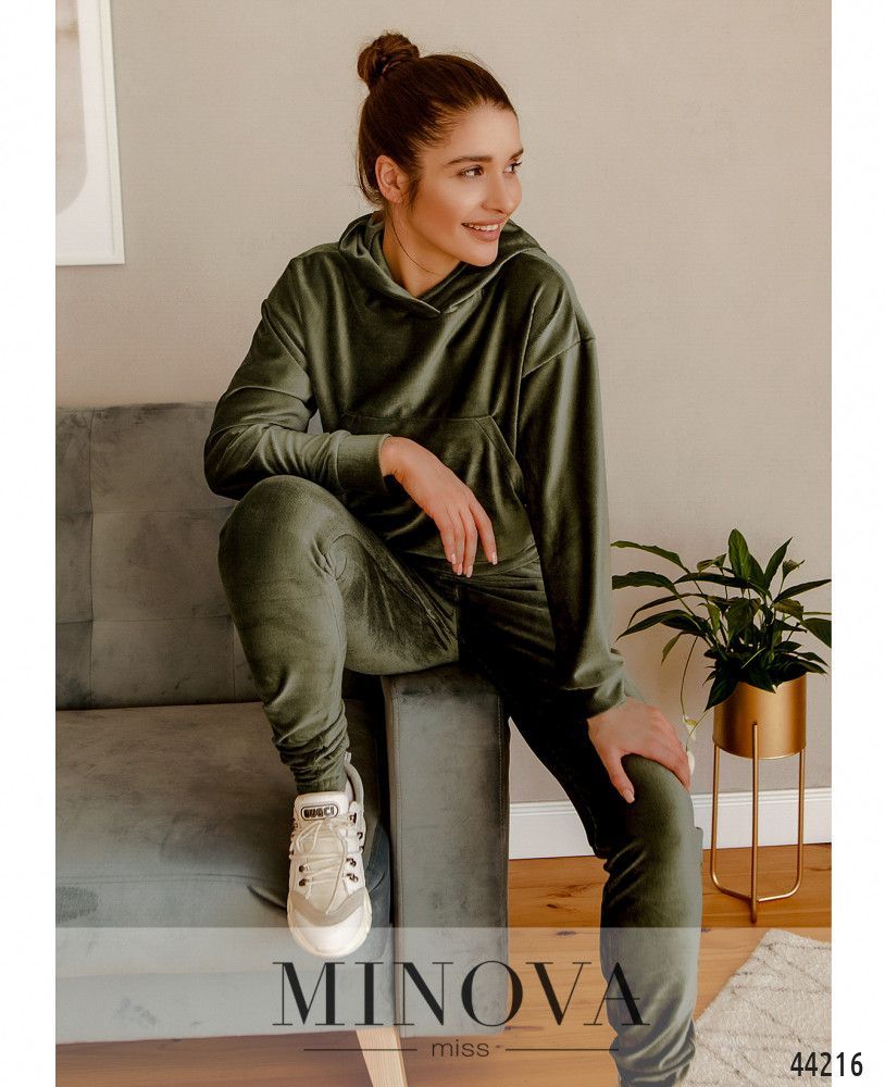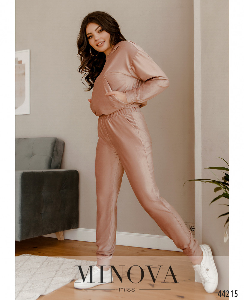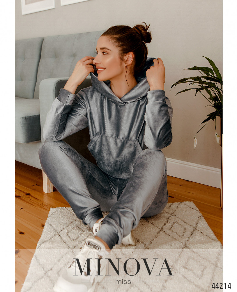 Мягкий и удобный спортивный костюм с толстовкой и брюками. Толстовка с капюшоном без шнурков и с объёмным карманом-кенгуру на талии, рукава и подол с мягкими манжетами. Без застёжек. Брюки с высокой талией, с манжетами, в пояс вшита резинка, по бокам карманы в шве.
