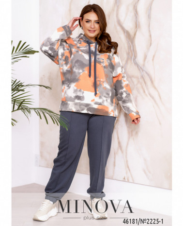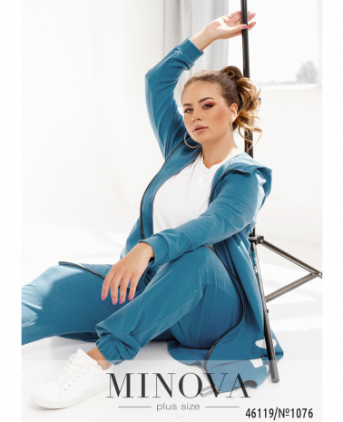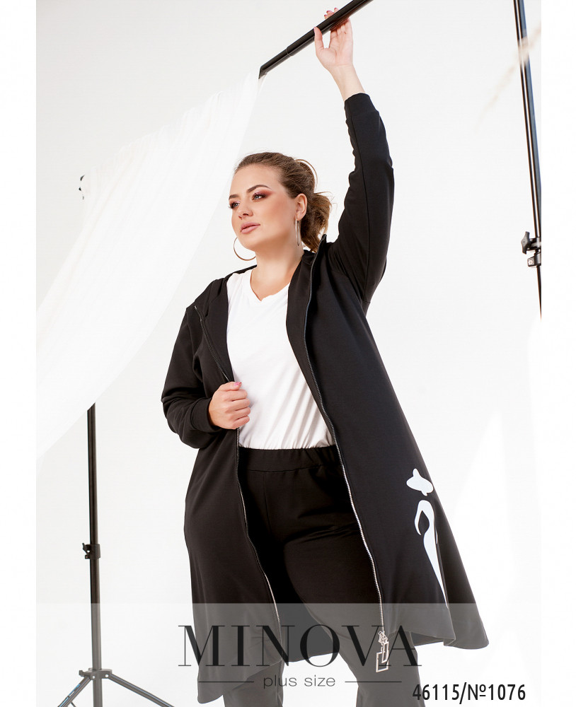 Элегантный и стильный костюм тройка большого размера. Верхняя рубашка удлинённая, с отложным воротничком, на груди накладной карман, по бокам - длинные разрезы. На рукавах манжеты, на манжетах по одной пуговке. Брюки с высокой талией, по бокам - карманы в шве, в пояс вшита резинка. Майка с полукруглым вырезом горловины, на груди вытачки, по бокам подола - разрезы. Без карманов и застежек.