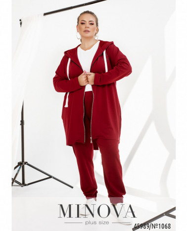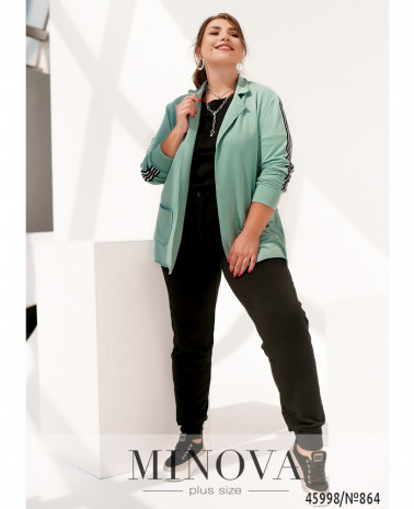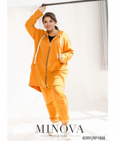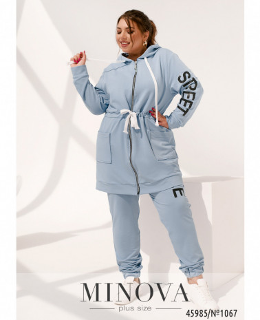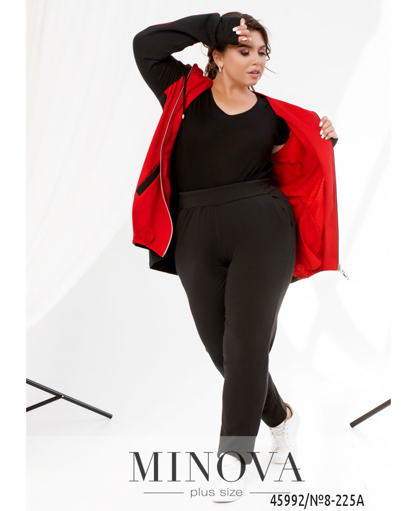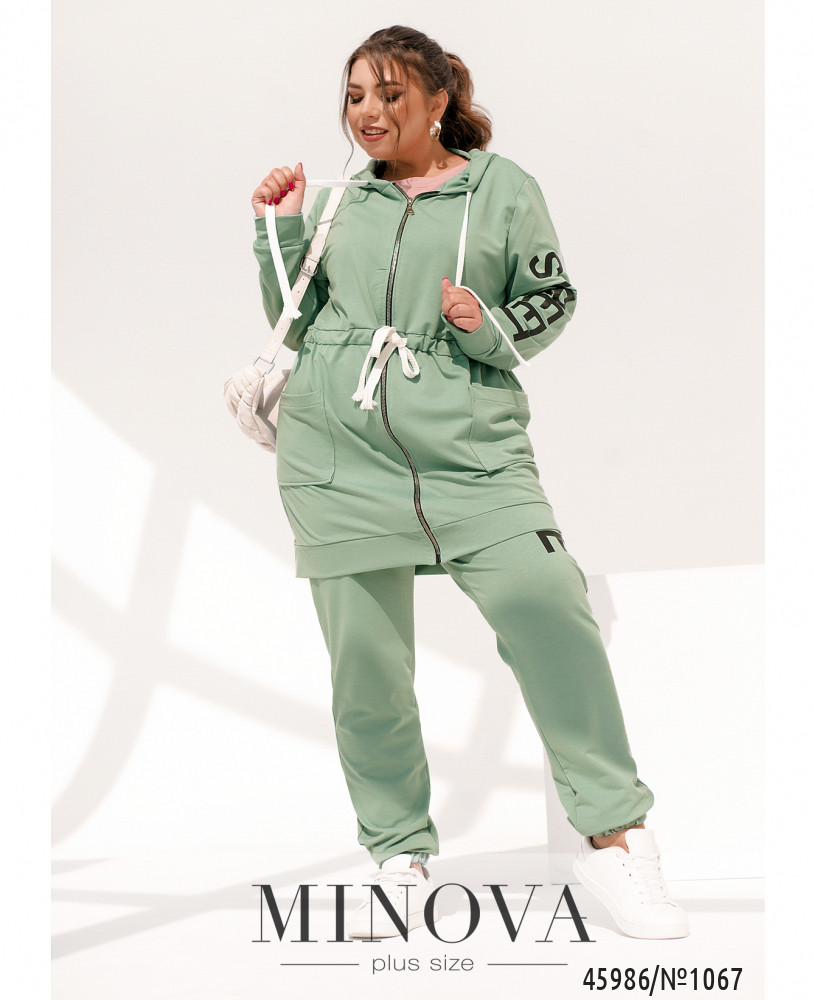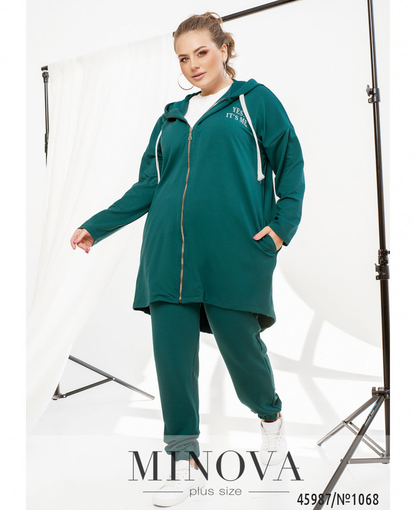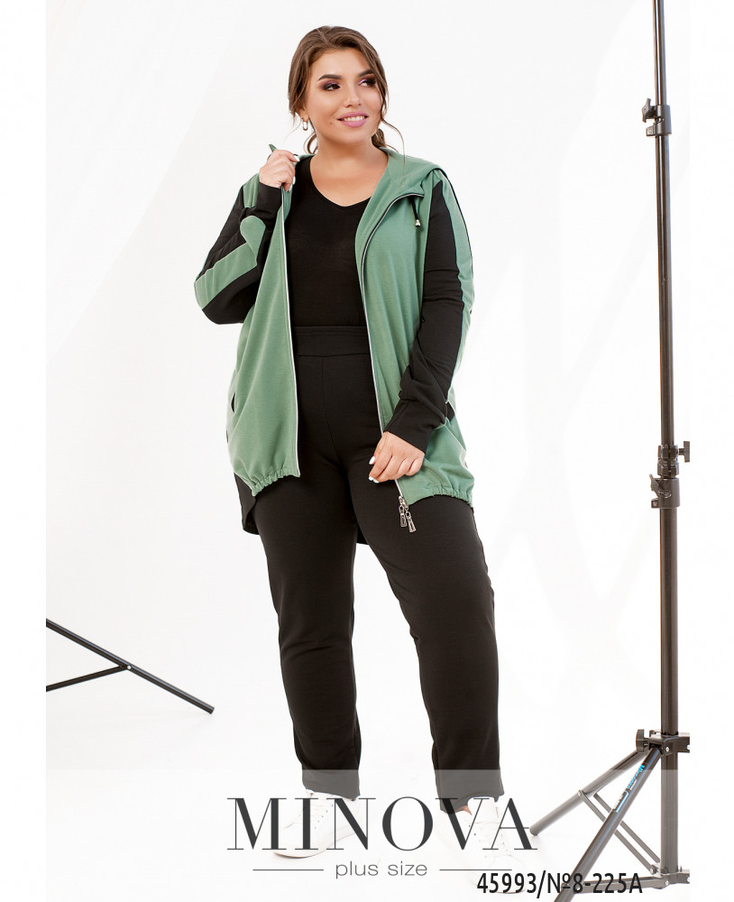 Удобный и яркий повседневный костюм-двойка батал в спортивном стиле. Кофта с молнией по центру, застёгивается на два бегунка, по бокам - карманы, рукава с мягкими манжетами, в наличии капюшон, через него пропущен шнурок. Брюки с высокой посадкой, по бокам - карманы, в пояс вшита резинка, без манжет.