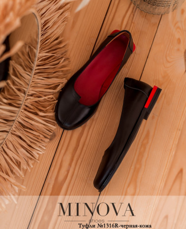 Мінімалістичні шкіряні туфлі з язичком, на зручній гнучкій підошві, з відрізним заднім ременем. Без застібок. На язичку декоративний шов.