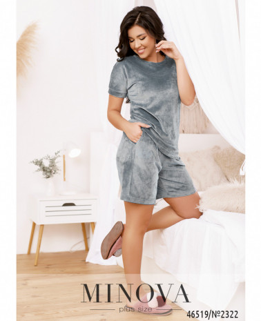 Стильний домашній костюм, виконаний з м'якого велюру, подарує Вам комфорт і додасть впевненості у своїй привабливості. У комплект входить однотонна лаконічна футболка з напівкруглим вирізом горловини, а також шорти вільного крою на резинці з кишенями. Комплект прикрашений блискучою декоративною аплікацією.