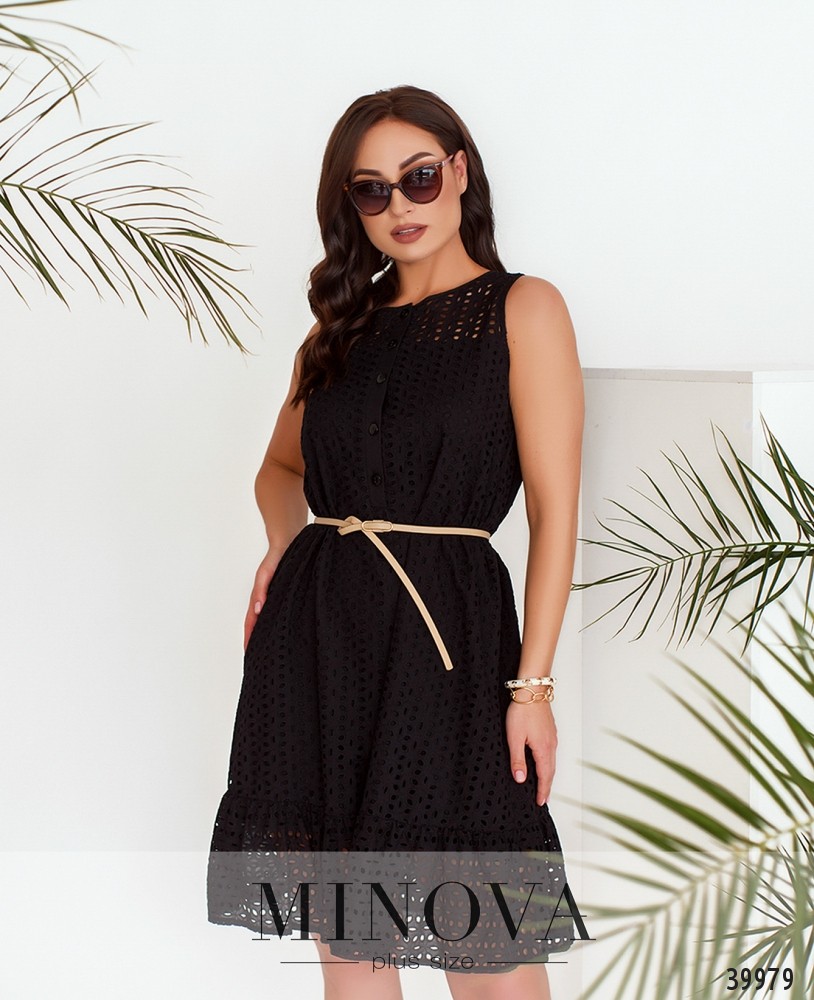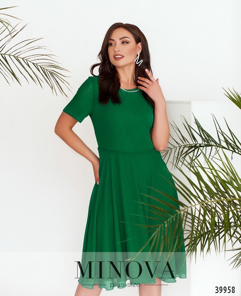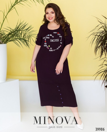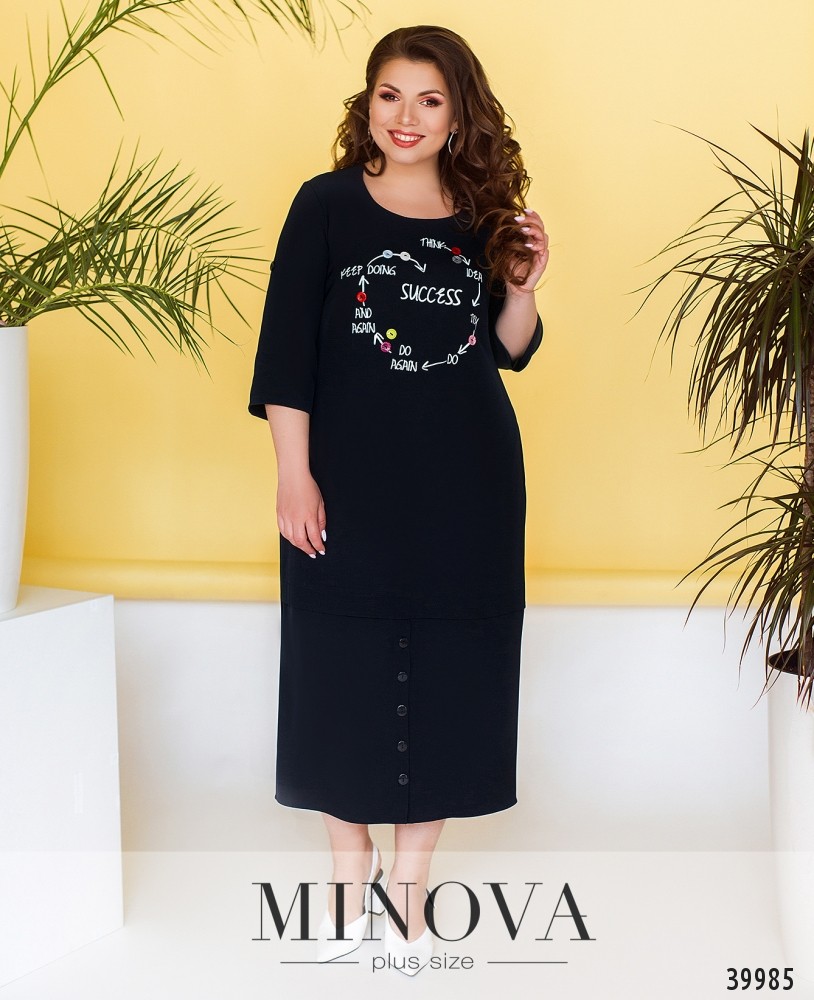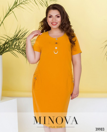 Лёгкое и стильное платье батал с врезными карманами по бокам, рукава короткие, с подворотами, вырез горловины неглубокий, на груди вытачки, застёжек нет.
