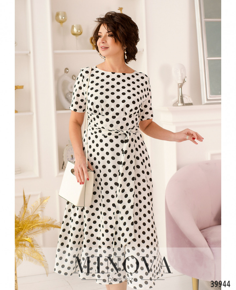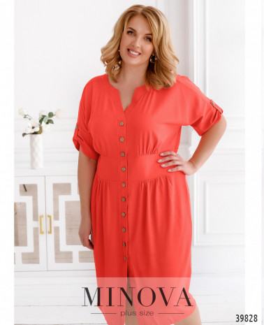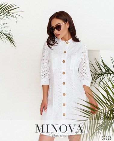 Ажурна сукня батал з підшитим м'яким нижним шаром. Рукава - подовжені "ліхтарики" з манжетами, без гудзиків. Комірець відкладний, на грудях - накладні кишені, застібається на низку гудзиків спереду на планці.