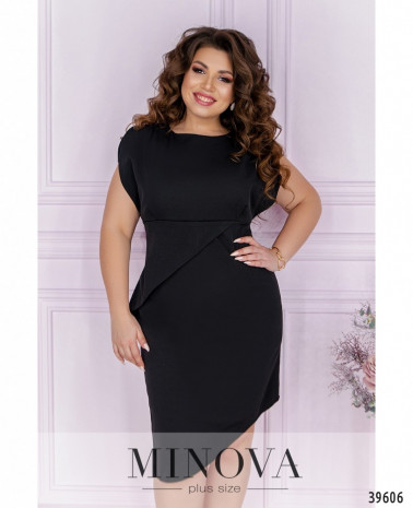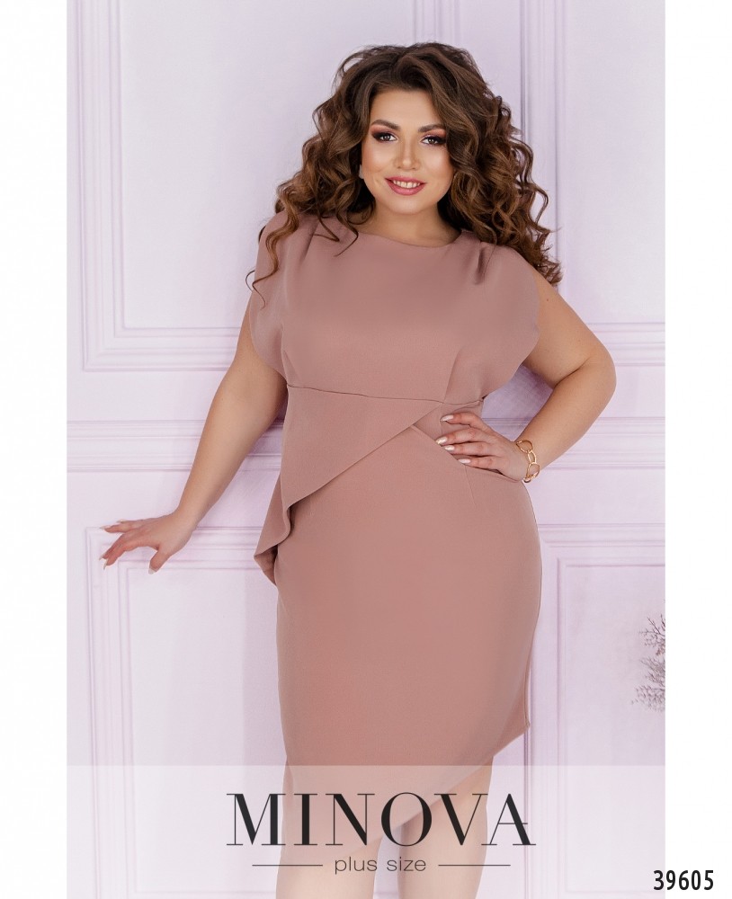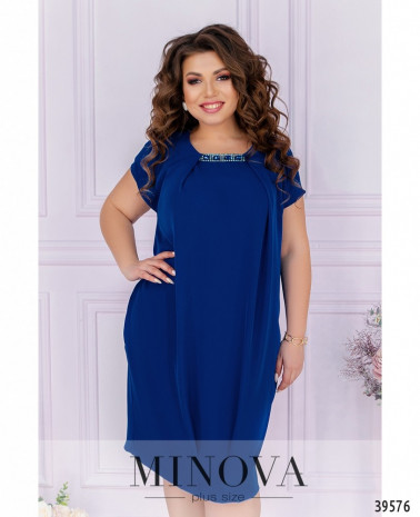 Чепурна та оригінальна сукня плюс сайз з ілюзією підшитої накидки. Виріз горловини півкруглий, під ним - декор з камінцями, тканина призібрана вгорі і внизу. Рукава дуже короткі, без манжетів. З обох боків - прорізні кишені, застібок немає.