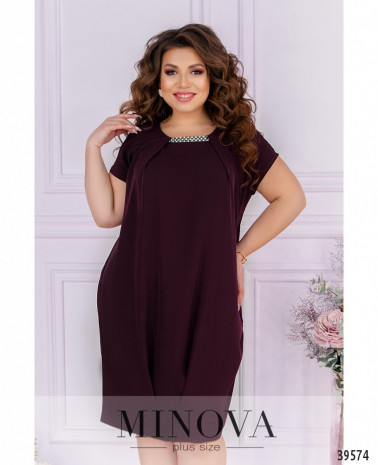Нарядное и оригинальное платье плюс сайз с иллюзией подшитой накидки. Вырез горловины полукруглый, под ним - декор с камнями, ткань присобрана сверху и снизу. рукава очень короткие, без манжет. По бокам - врезные карманы, застёжек нет.