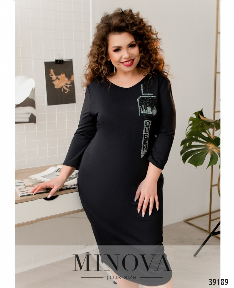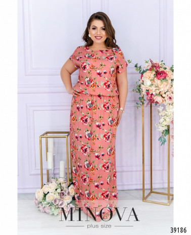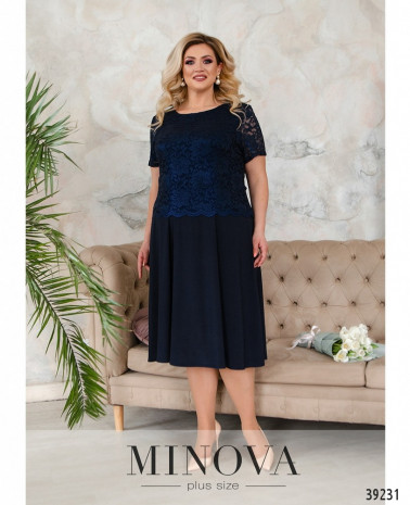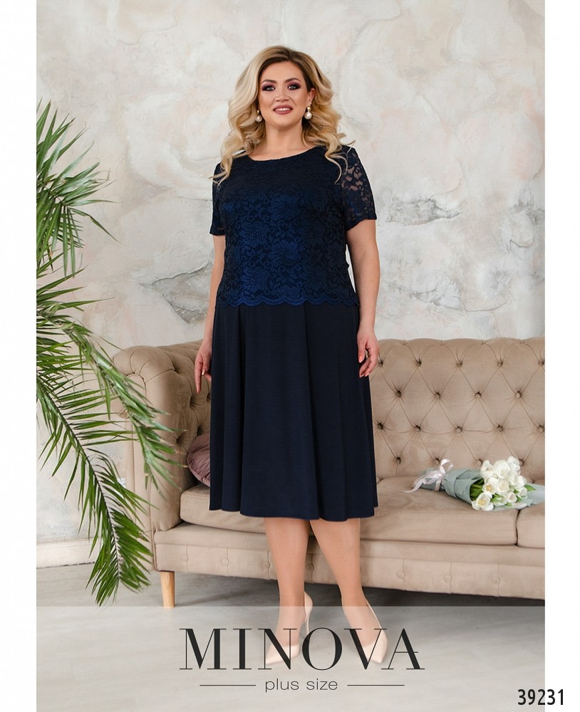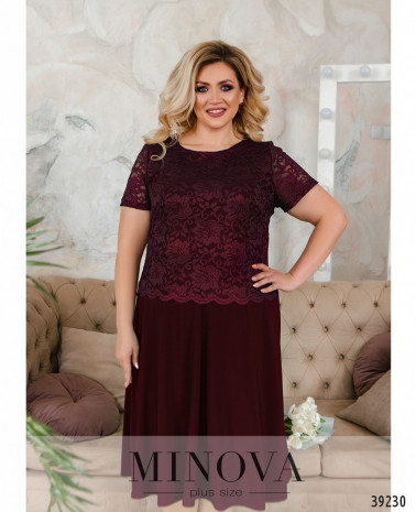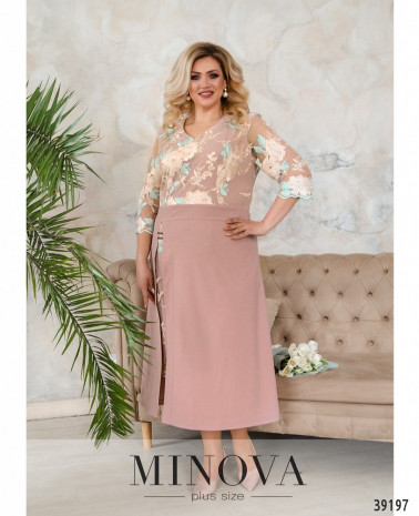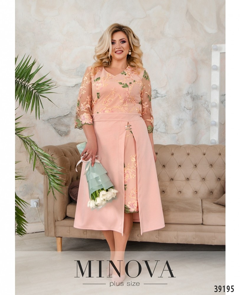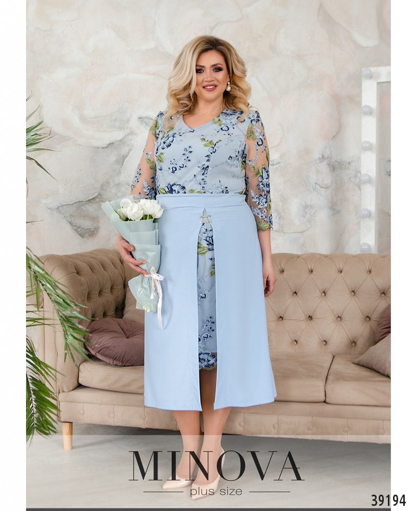 Нарядное вечернее платье батал с ажурной сеточкой на лифе, украшенной вышивкой - спереди и по спинке. Лиф с подкладкой, рукава - из прозрачной сеточки, без манжет. Подол подшит к верху, с разрезом, прихваченным двумя декоративными металлическими нашивками, под ним - вставка сеточки с вышивкой. Сзади на подоле шлица, застёжка - вшитая по спинке молния. Карманов нет. Вырез горловины неглубокий.