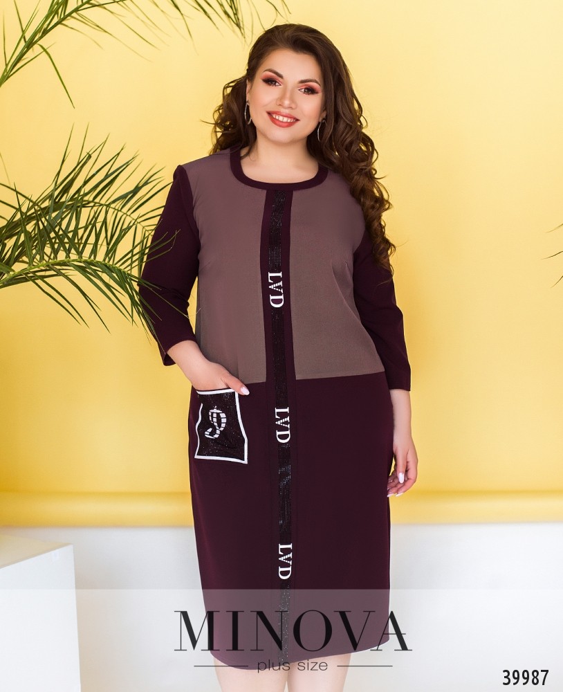 Стильна та оригінальна сукня великого розміру без застібок, з півкруглим вирізом горловини. На грудях виточки, справа на стегні - накладна кишеня, прикрашена декором зі страз. Силует приталений. Рукава без манжетів.