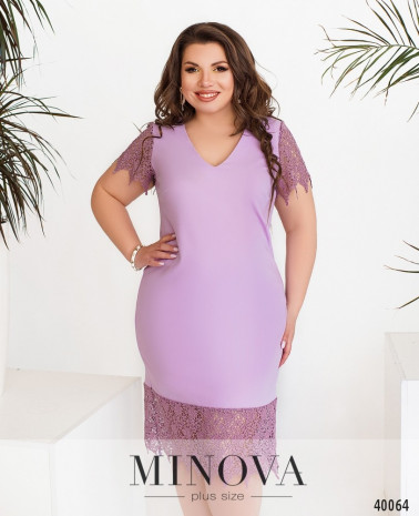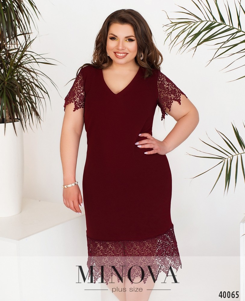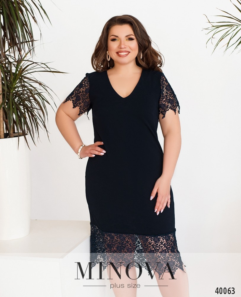Коктейльна сукня батал з ажурним мереживом на подолі та на рукавах. Виріз горловини V-форми, неглибокий, кишень та застібок немає. Силует приталений. На грудях виточки.