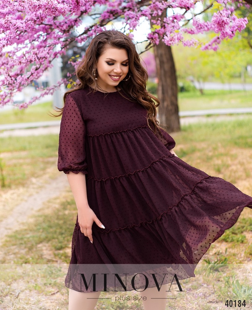 Легка, зручна та приваблива сукня батал з підкладкою та сіточкою. Сіточка призібрана оборками в декілька рядів. Рукава - из сіточки без підкладки. На зап'ястках вшиті резинки. Кишень та застібок немає, виріз горловини - "човник".