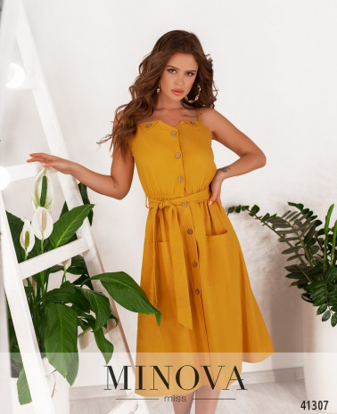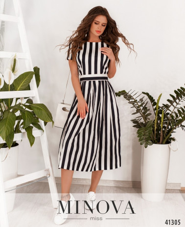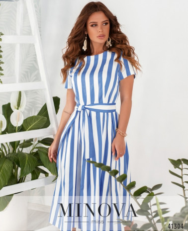 Яскрава смугаста сукня з поясом, поділ підшитий до ліфу та призібраний оборками. Застібка - вшита по спинці прихована блискавка. З боків - прорізні кишені. Рукава короткі, без манжетів.