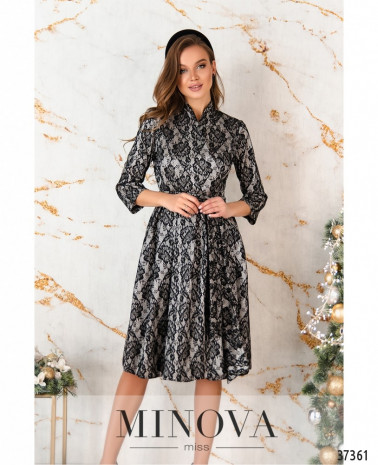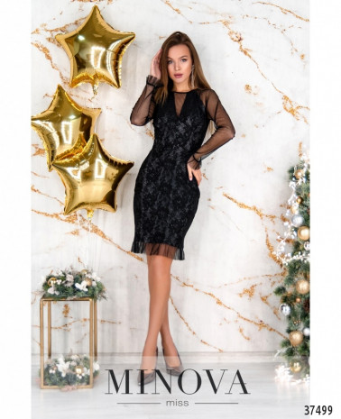 Елегантна вечірня приталена сукня з люрексом та блискітками. Плечі та рукава – з напівпрозорої сіточки з блискітками. Рукава та поділ прикрашені оборками з сіточки. Спинка та передня частина повністю закриті. На тканині зверху – квіткові візерунки. Застібається на вшиту по спинці змійку, кишень немає. Виріз горловини півкруглий, ущільнений.