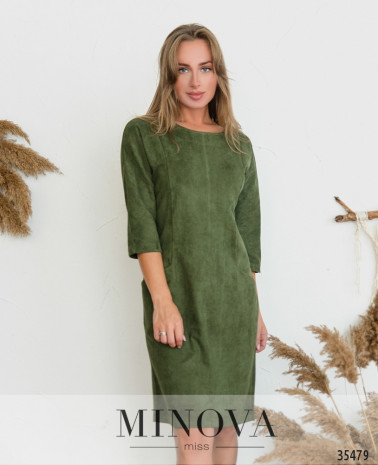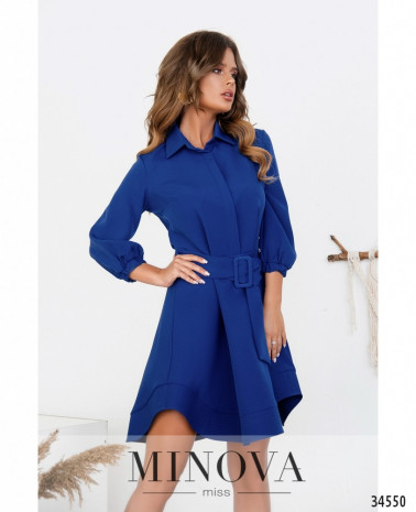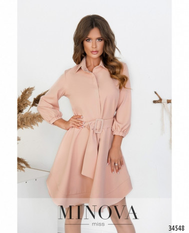 Сукня-сорочка А-силуету. Сукня з відкладним комірцем, рядом круглих гудзиків від комірця до грудей, рукава довжиною ¾. На рукавах через шлівки пропущений поясок, як на плащі-тренчкоті, поясок можна зав\'язати бантом. Поділ асиметричний, по спинці дещо довше, з боків підшито на невеликий запин. На грудях виточки, кишень немає.