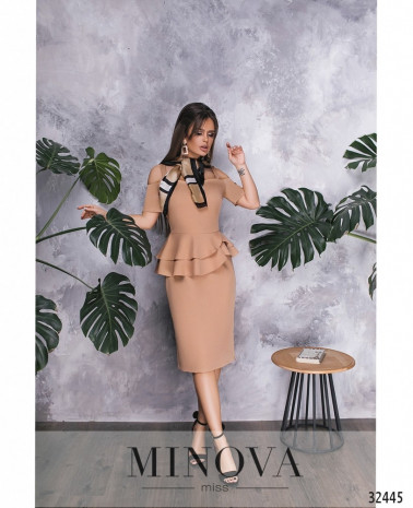 Оригінальна сукня по фасону нагадує сорочку, на талії вшито пояс. Гудзики – до низу подола, воротник-стійка, рукава застібаються на манжетах, регулюються стрічкою і гудзиком.