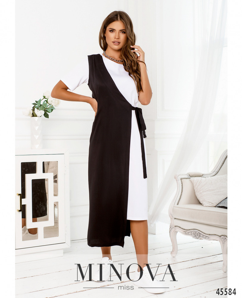 Якщо вам подобається самовиражатися через свій стиль і ви любите одяг незвичайного несподіваного крою, то зверніть увагу на цю модель. Елегантна мінімалістична сукня міді з короткими рукавами і напівкруглим вирізом горловини в комплекті з подовженою контрастною накидкою на одне плече, що зав'язується збоку на талії, зробить ваш образ стильним, модним і вишуканим. Ви можете носити їх разом або окремо, створюючи різні образи з іншими речами.