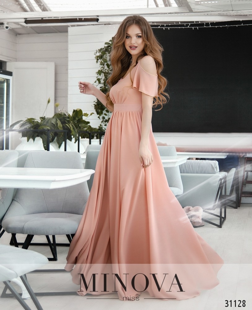 Ніжна та романтична сукня з шифону. Відрізний ліф на тонких бретельках з рукавами-воланами та задрапован ближче до поясу. Талію охоплює відрізний пояс-вставка. Поділ зібраний в дрібні складки. На спині сукня з вирізом, застібається на приховану блискавку. Виріб з підкладкою.