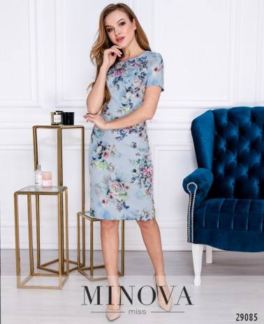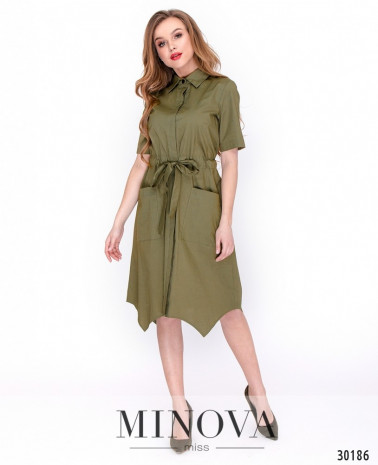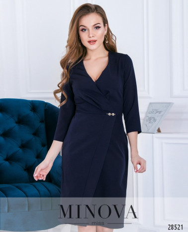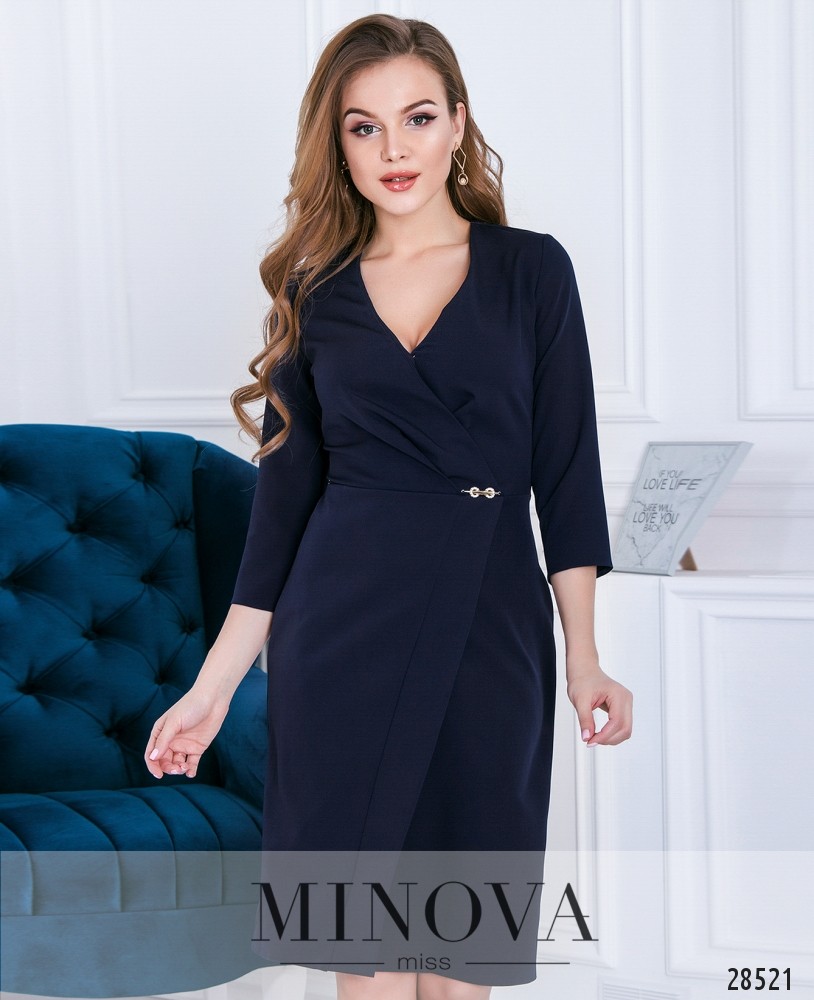 Классическое платье с вырезом и подолом на запАх. Отрезной лиф с рукавами ¾ украшен защипами, создающими эффект драпировки. Отрезная линия талии украшена пришитой декоративной деталью. На спине платье застегивается на скрытую молнию.