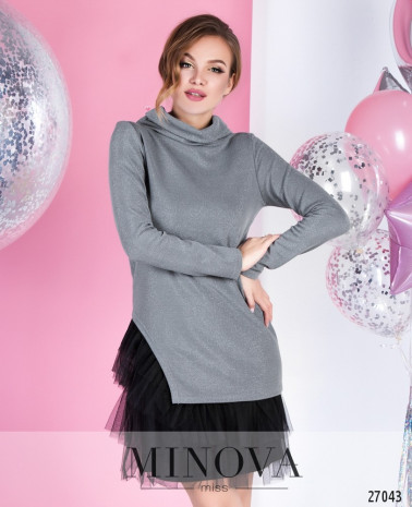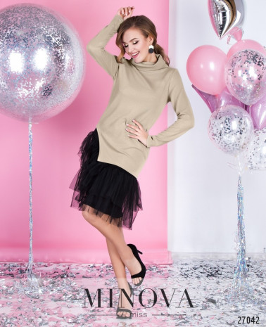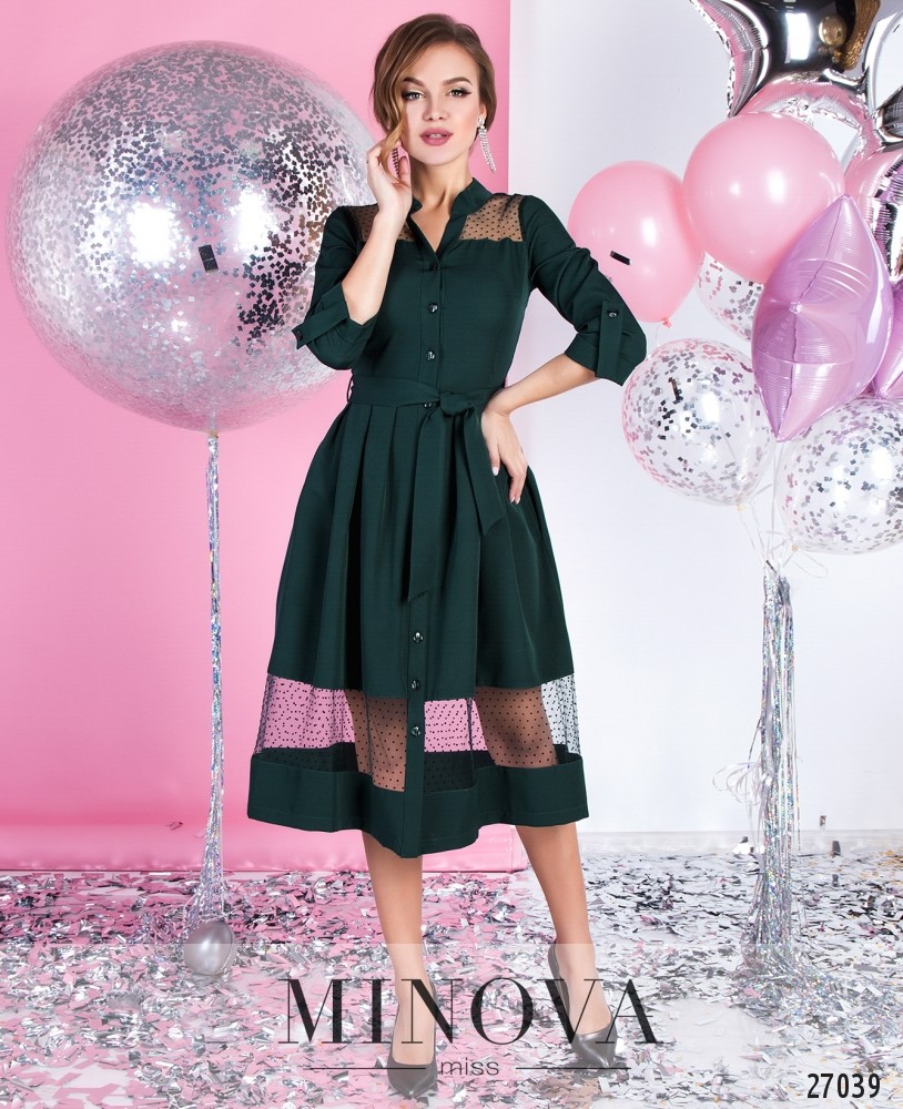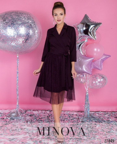 Ошатна сукня-сорочка зі знімним поясом і розкльошеною подвійною спідницею. Приталений ліф з витачками на грудях оформлений V-подібним вирізом на запАх з відкладним коміром і рукавами ¾. Відрізний від талії подол, що обіграний подовженою пачкою з сітки з делікатним блискучим напиленням. Гра двох довжин привертає увагу до краси ніжок. Сукня застібається на приховану бічну блискавку.