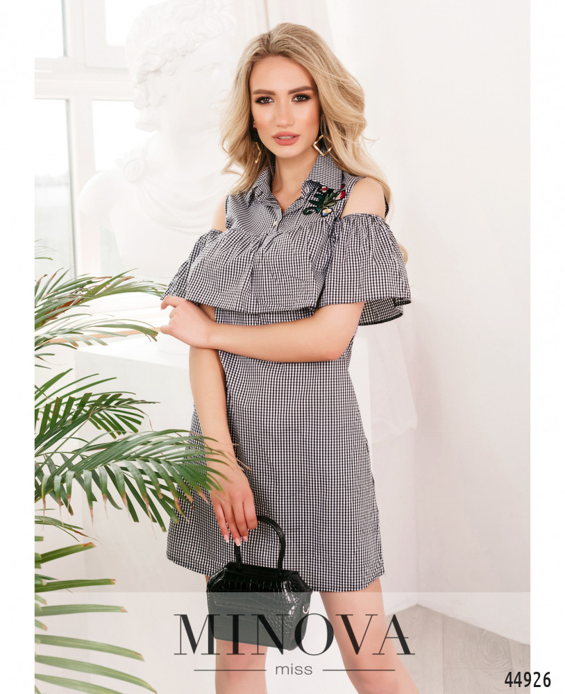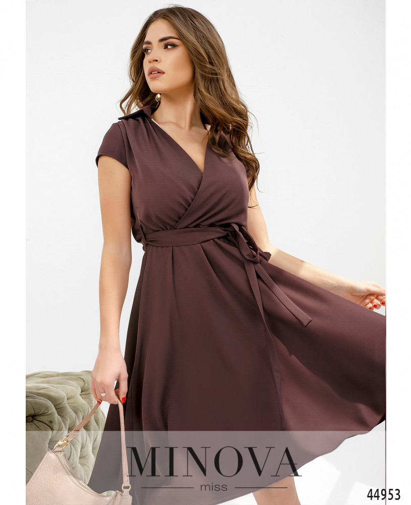 Елегантна сукня з глибоким декольте і підшитим на запин ліфом, комірець відкладний, на спинці під комірцем - виріз V-форми. Ліф з підшитою підкладкою. До поясу вшито резинку, поділ спадає м'якими оборками. На талії шлівки для поясу. Рукава-крильця без манжетів. Застібок та кишень немає.