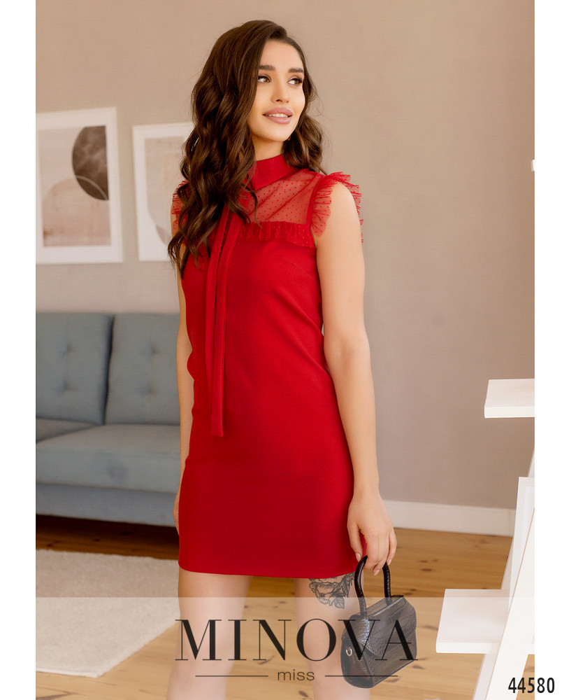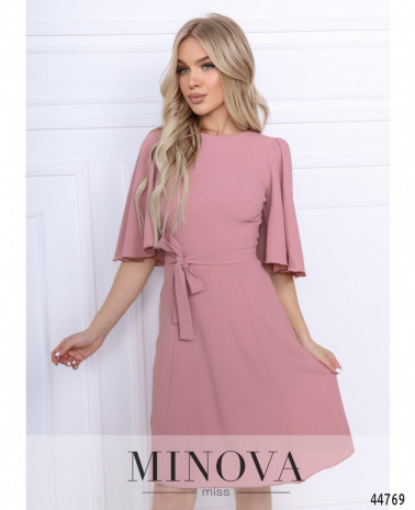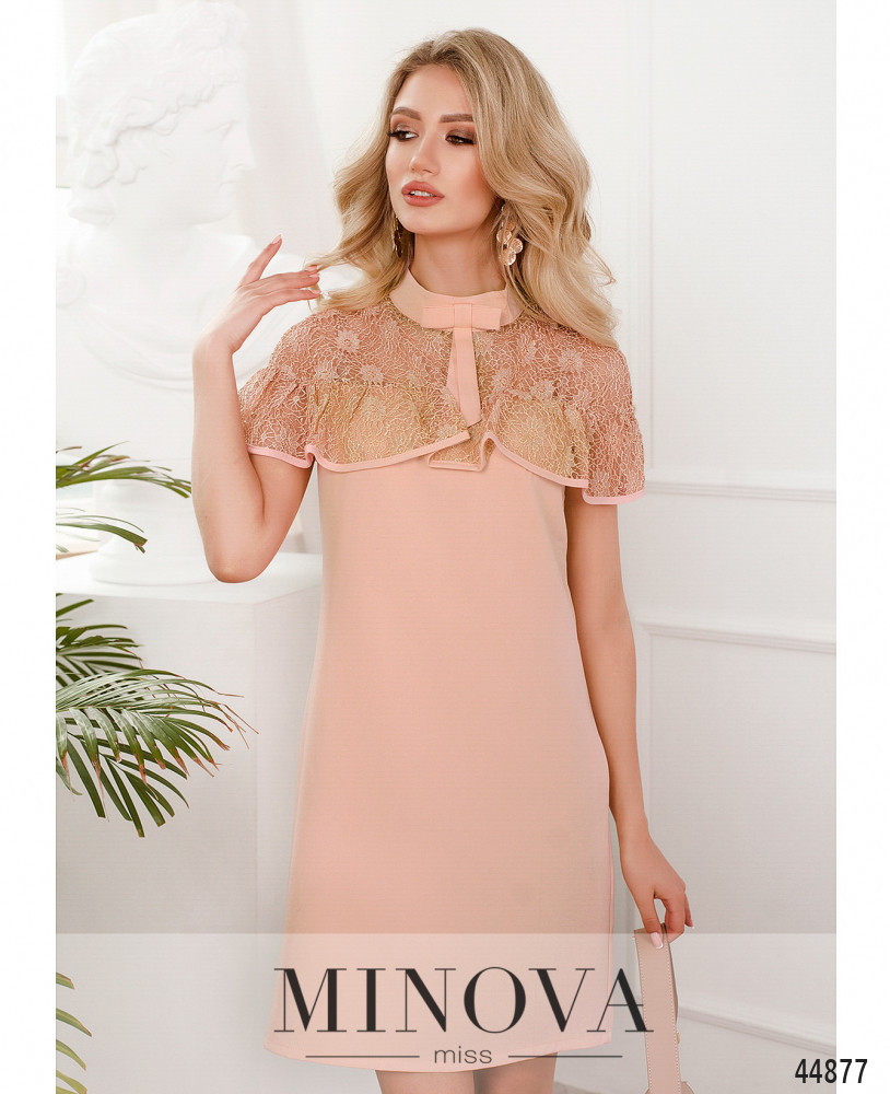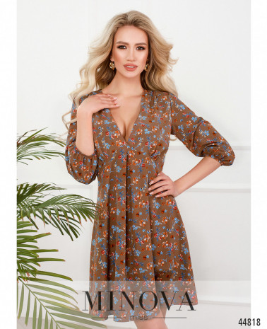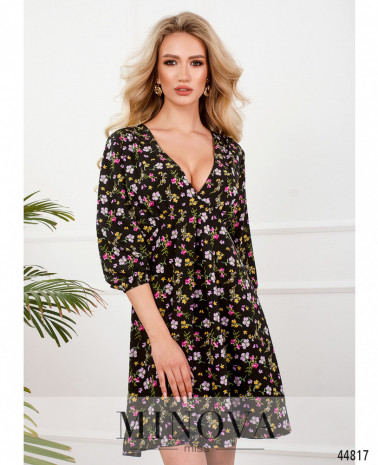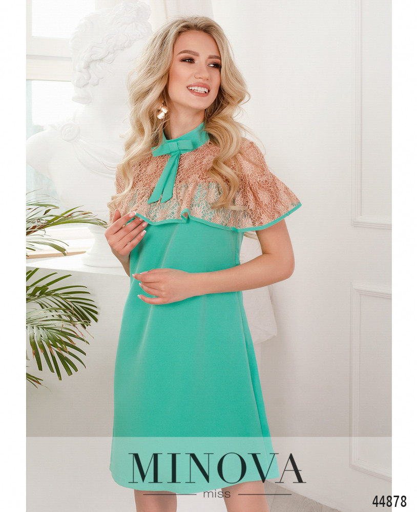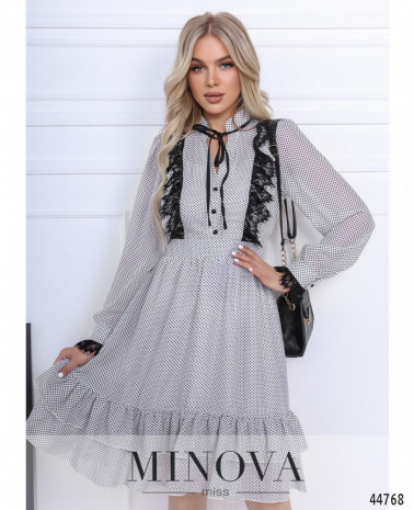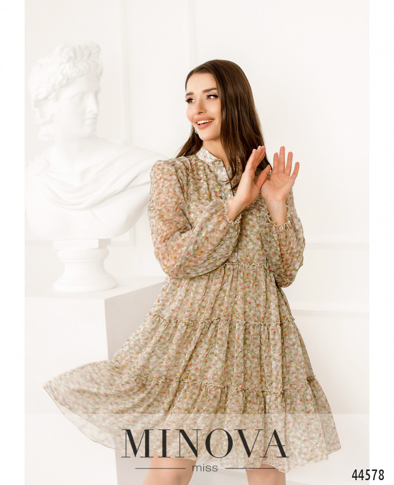 Приваблива сукня з відрізним подолом, без кишень, гудзики від комірця-стійки до талії. Внизу на подолі оборки. Через рукава на манжетах пропущено зав'язку, манжеті призібрані оборками. На грудях виточки.