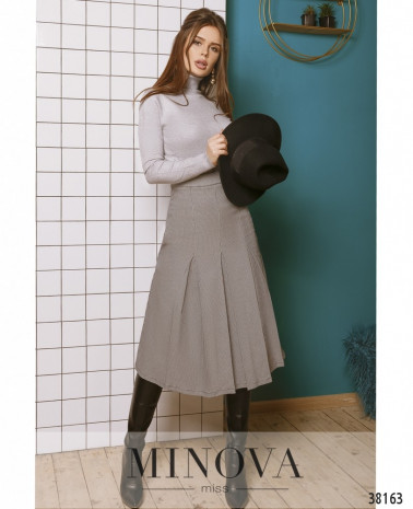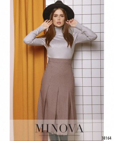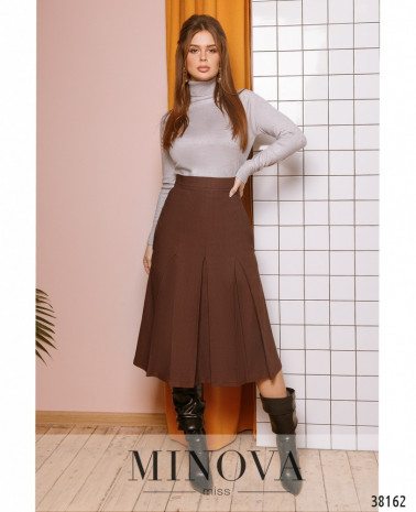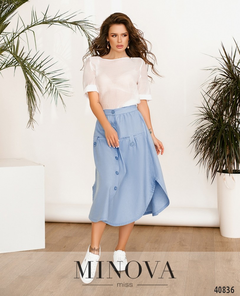 Легка мінімалістична спідниця-сонце, застібається на ряд гудзиків на планці, спереду - дві прорізних кишені з клапанами. До поясу ззаду вшито резинку. З боків подолу - округлені розрізи.