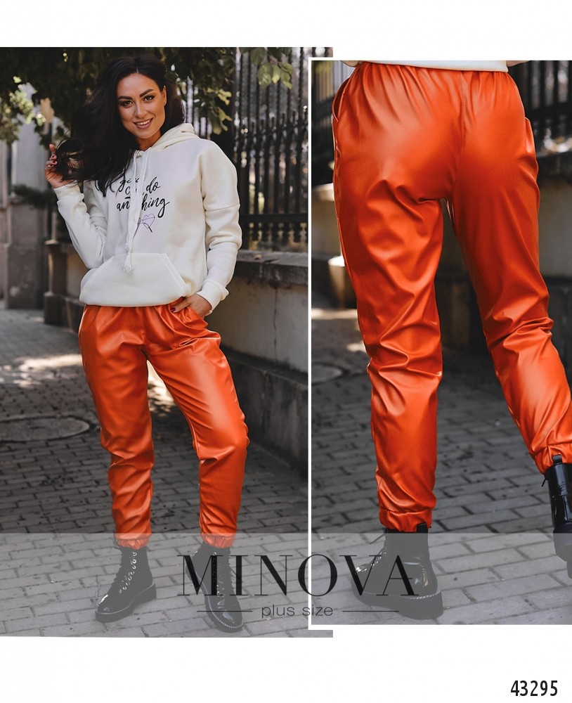 Стильные брюки батал с высокой посадкой, в пояс вшита резинка и пропущен шнурок, манжеты также на резинке. В наличии врезные карманы по бокам.