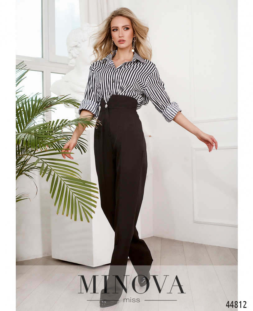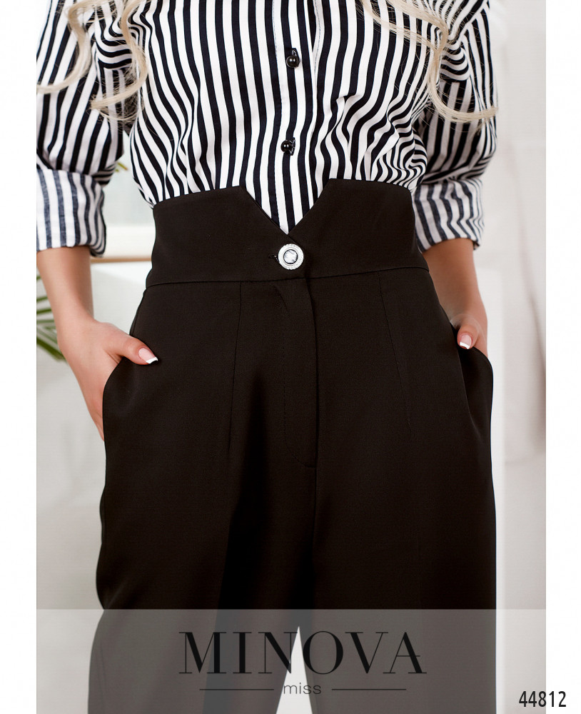 Стильные брюки с высокой талией, застёгиваются на пуговку и молнию под ширинкой. По бокам - карманы в шве. Спереди и сзади наглажены "стрелочки".