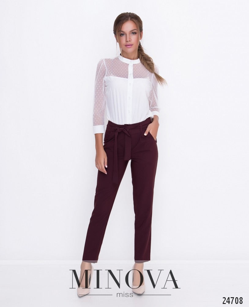 Зауженные брюки на высокой посадке с карманами и поясом с шлевками. Брюки застегивается на лицевой стороне на молнию и крючок.