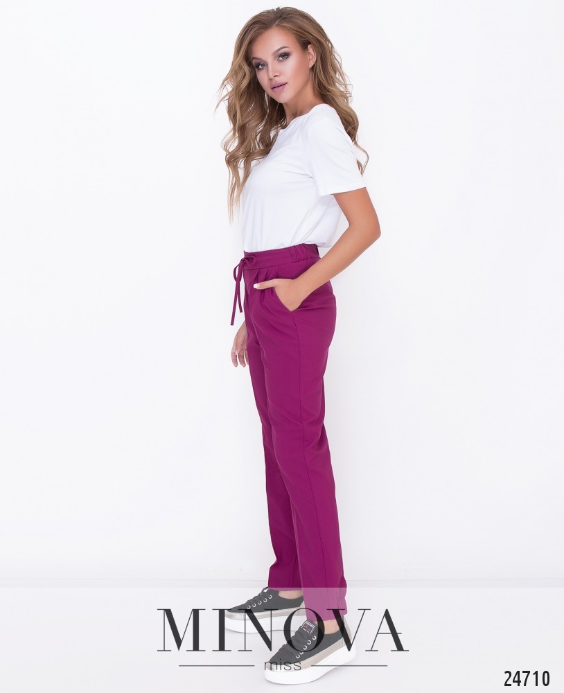 Брюки зауженного кроя на манжете идеально подойдут как офисный вариант, так и для повседневной носки. Изделие на средней посадке, пояс на резинке с кулиской. По бокам функционирующие карманы.