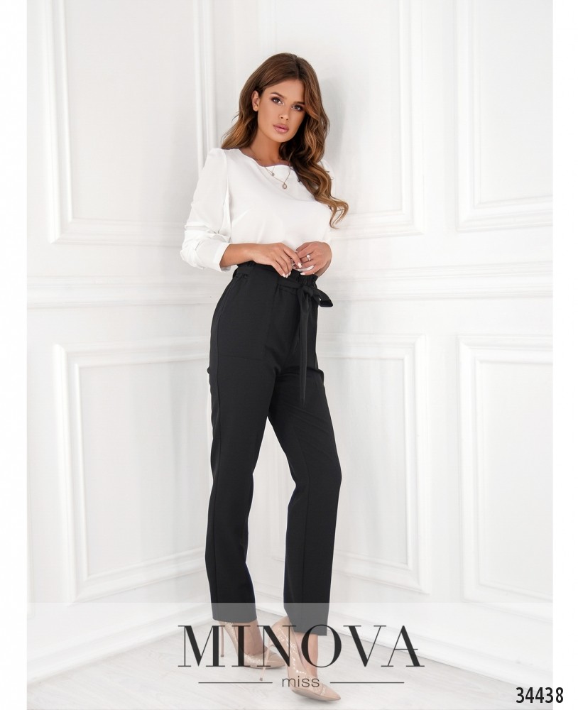 Стильные классические брюки из новой коллекции Minova будут удачно сочетаться с белыми блузами и яркими свитшотами! Брюки с высокой посадкой, в пояс вшита резинка, но ещё и есть застёжка: две пуговицы и змейка под ширинкой. В наличии пояс, пропущенный через широкие шлейки. По бокам – карманы, а ещё – «стрелочки», которые сделают образ более официальным и строгим. Но их не нужно постоянно отглаживать, ведь эффект «стрелок» достигается с помощью шва на всю длину брючины. На бёдрах сзади – декоративные клапаны. Выбирайте тёмный синий или чёрный оттенки, а также в каталоге есть модель в бирюзовой гамме.