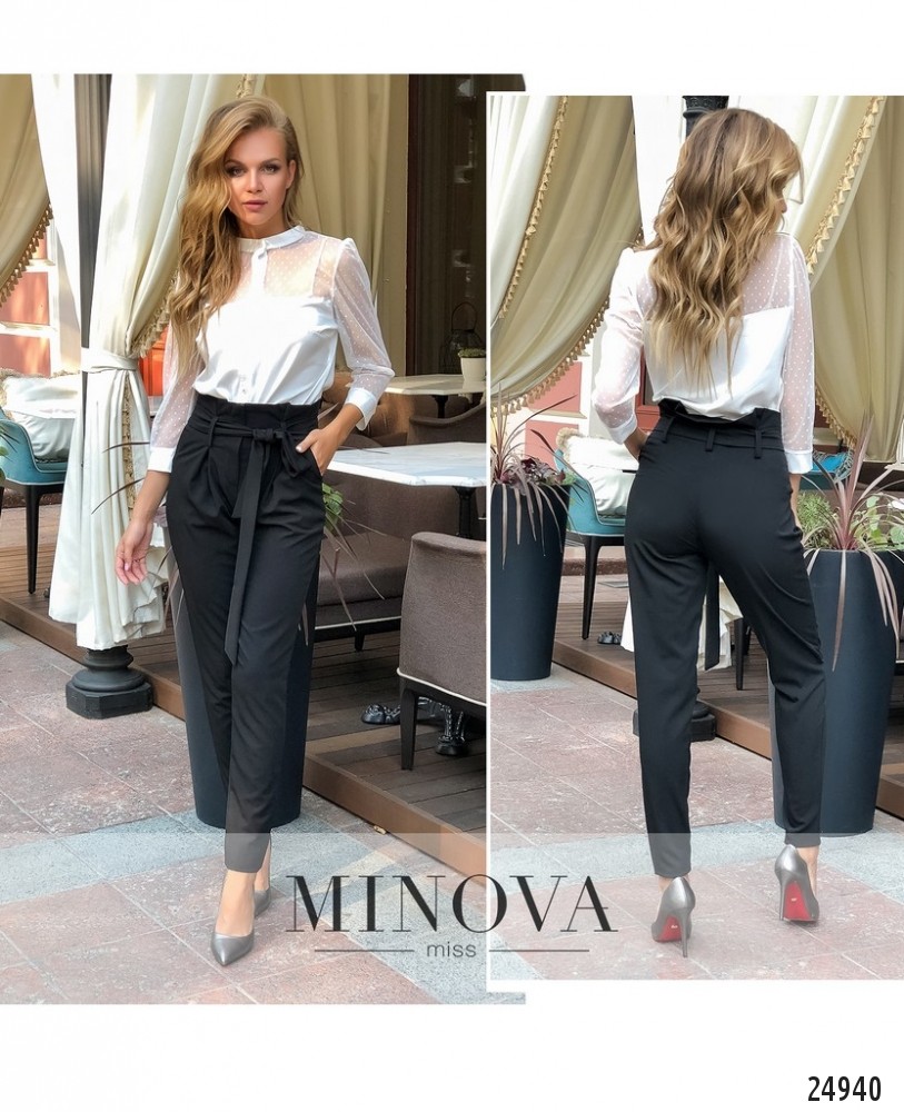 Трендовые зауженные брюки с карманами и пояском, дополнены защипами на лицевой стороне и широкой линией пояса. Низ брюк дополнен манжетом.