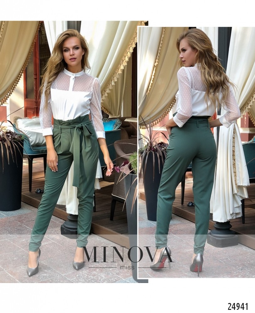 Трендовые зауженные брюки с карманами и пояском, дополнены защипами на лицевой стороне и широкой линией пояса. Низ брюк дополнен манжетом.