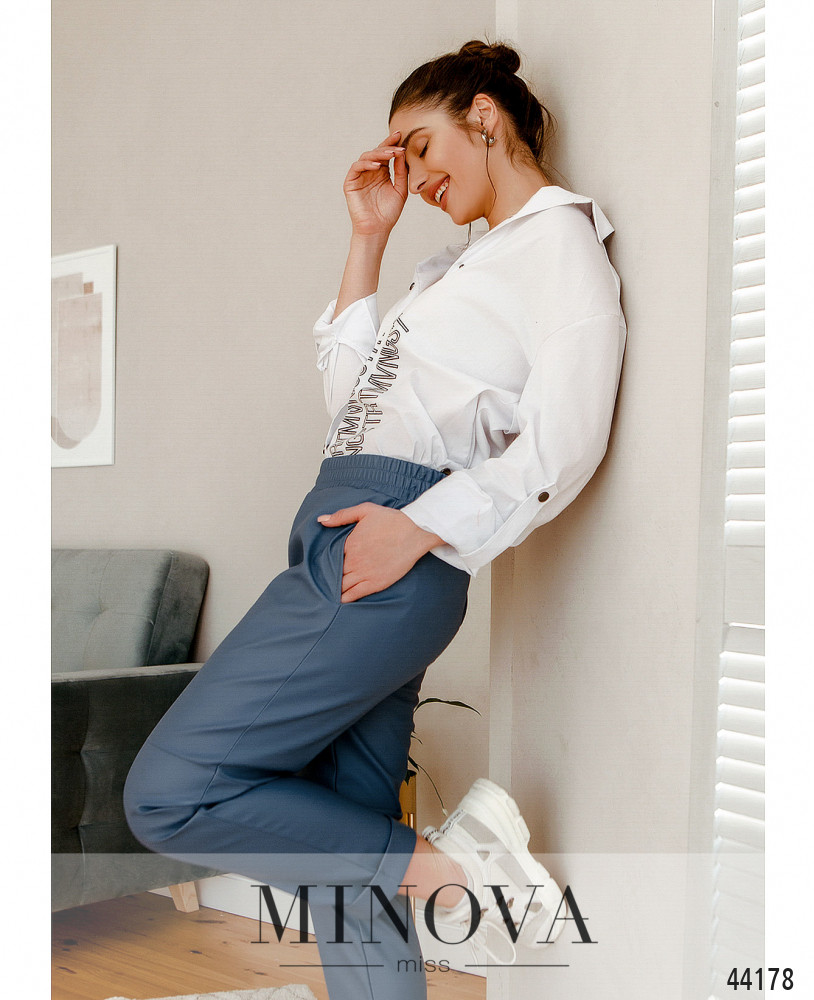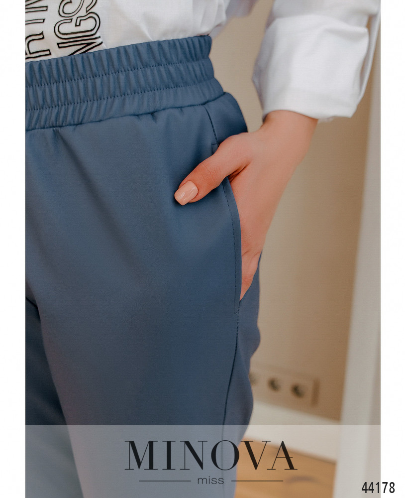 Элегантные и удобные брюки с карманами в шве, в пояс вшита резинка, изнутри - гладкий подкладочный слой. На бёдрах - декоративные швы, под поясом - декоративная ширинка. Снизу подвороты.
