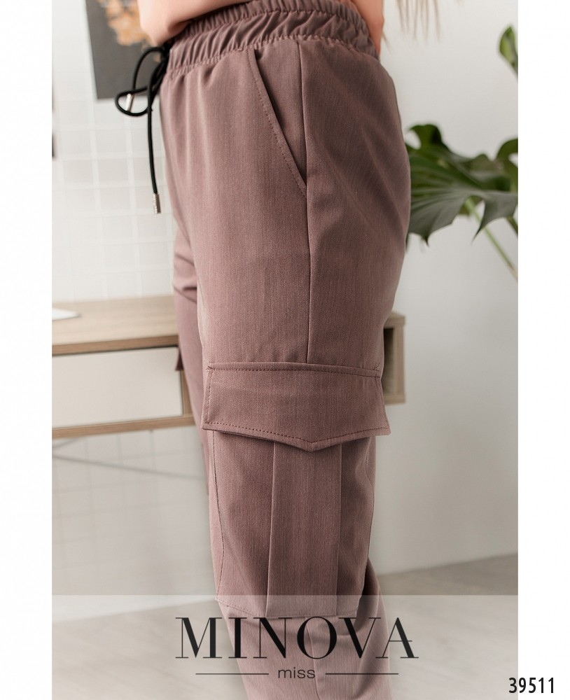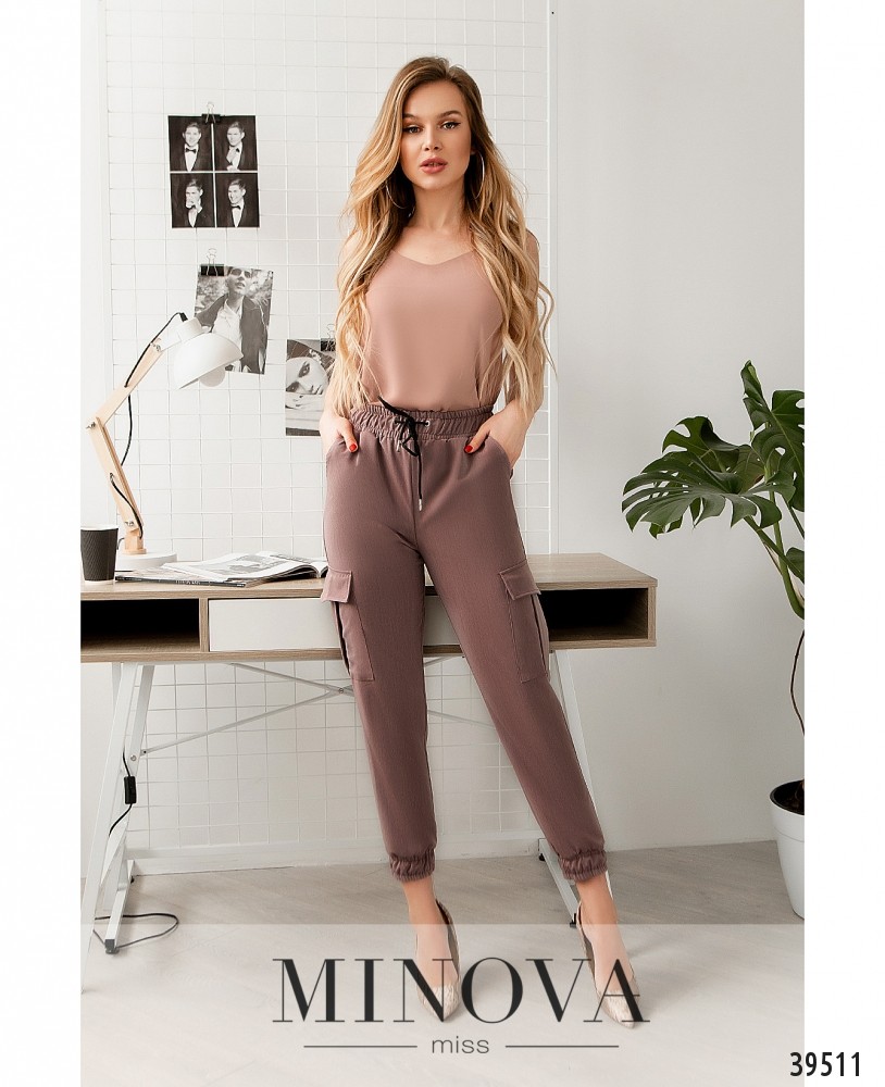 Удобные повседневные брюки с высокой посадкой, в пояс вшит шнурок и резинка, манжеты также с резинкой. По бокам - врезные карманы на талии и накладные - на уровне колена. Шнурки с металлическими эглетами. Ещё недавно джоггеры считались спортивными брюками. Но сегодня этот вид брюк выполнен из костюмной ткани и прекрасно сочетается с блузками. Данный модный образ в классическом стиле очень удобен.